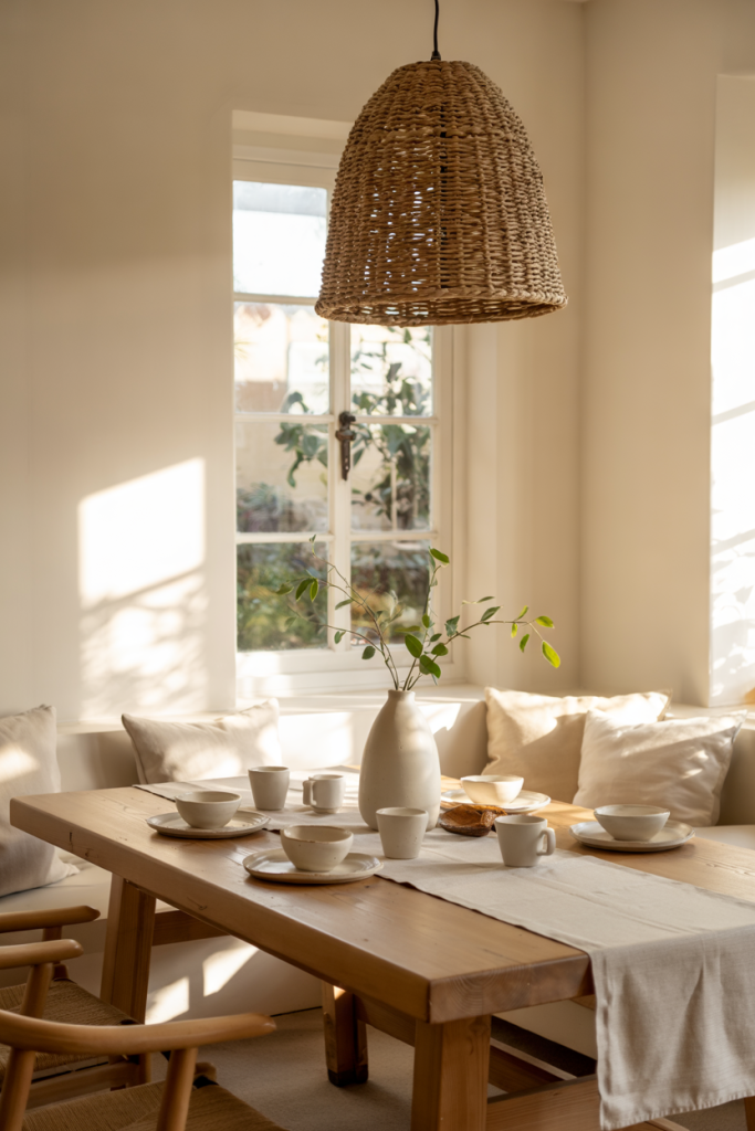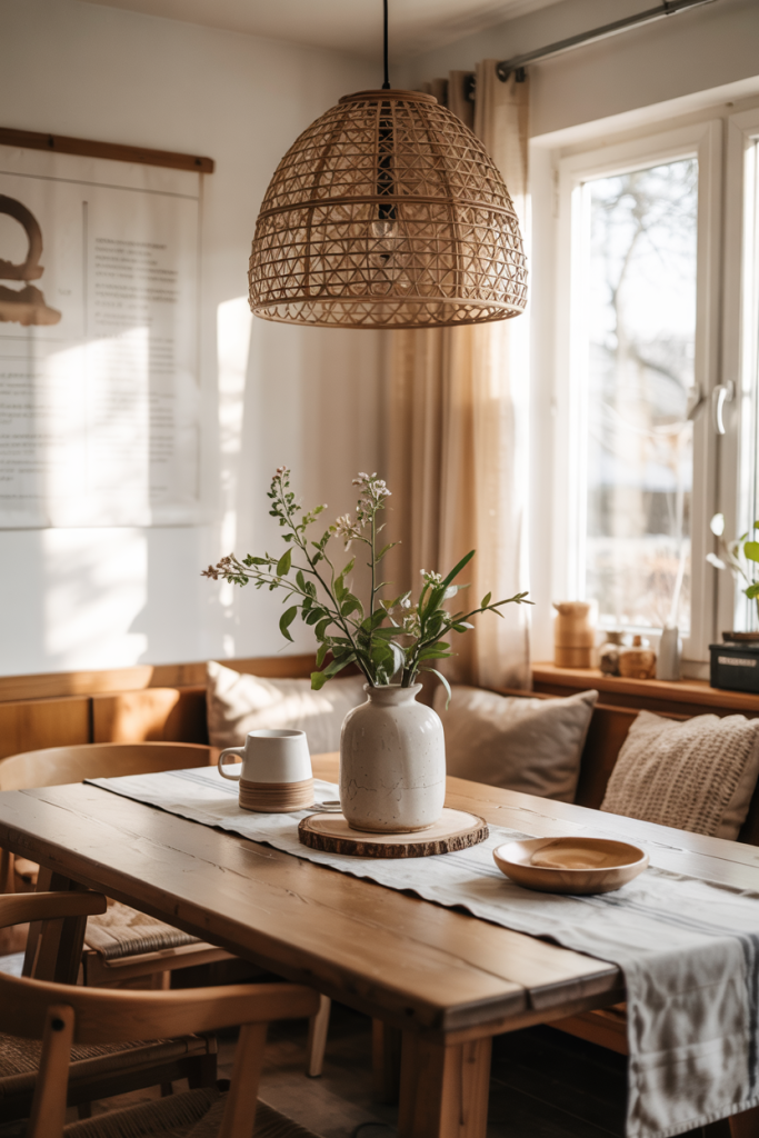 A rustic approach adds soul to Scandinavian spaces using natural materials and grounded tones. Warm woods mix effortlessly with ceramic accents, while a hint of rustic texture adds dimension. Infusing subtle elements of traditional Nordic charm and soft Japanese minimalism keeps the dining area visually centered.