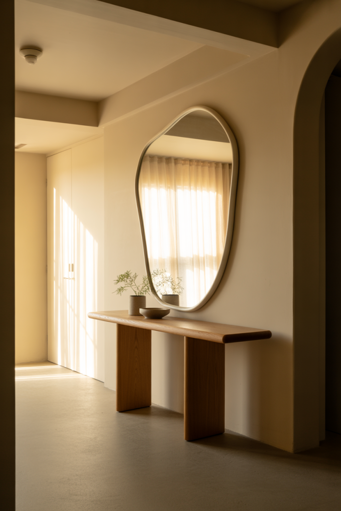 A mirror enhances the entry hallway. Large oversized shapes with organic frames will dominate ideas for mirror decor in 2026. In addition to style, mirrors reflect light and help make the entrance more light and airy.