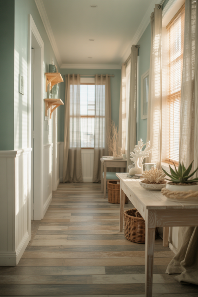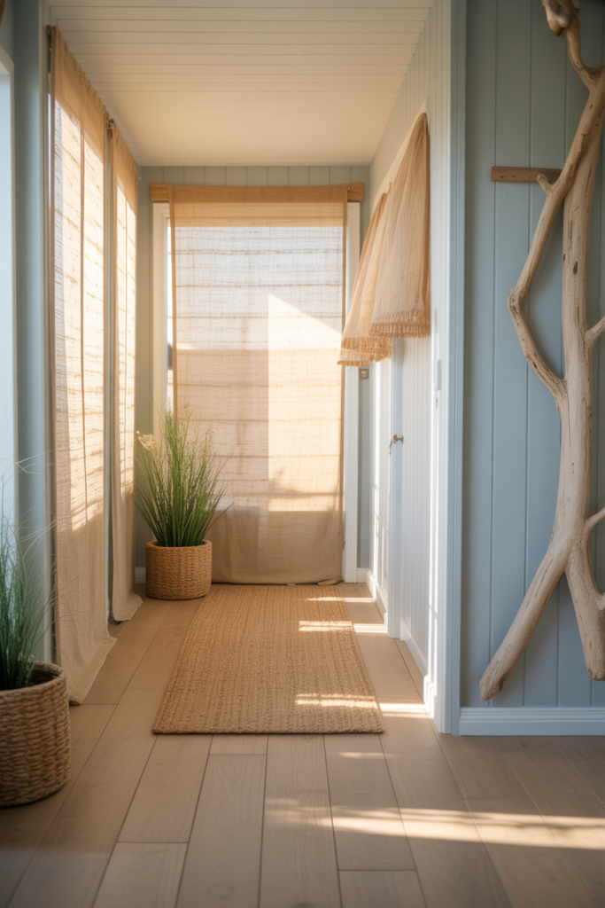 Natural light and soft shades of blues and sandy beiges are used in the decorating of coastal-inspired hallways. This relaxed atmosphere is perfect for homes near the ocean, as well as homes in the countryside.