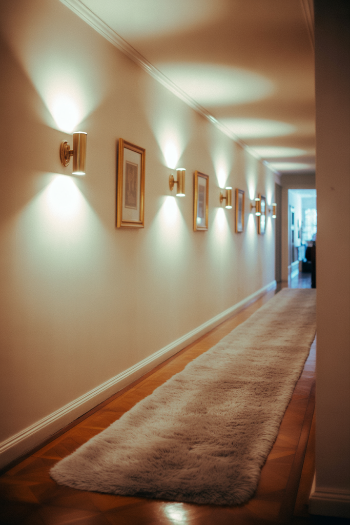 Where it works best: This idea shines in townhouses and suburban homes with long interior corridors. Consistent spacing between lights or frames helps guide the eye forward, making the hallway feel purposeful rather than like leftover space.