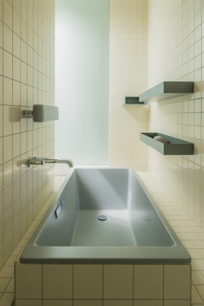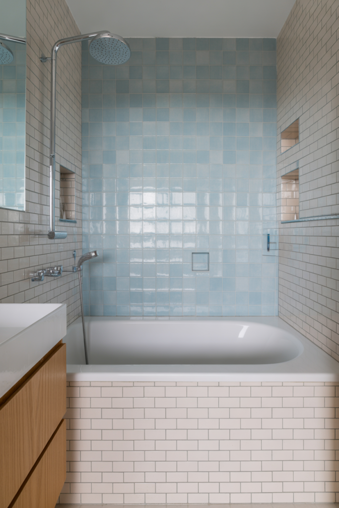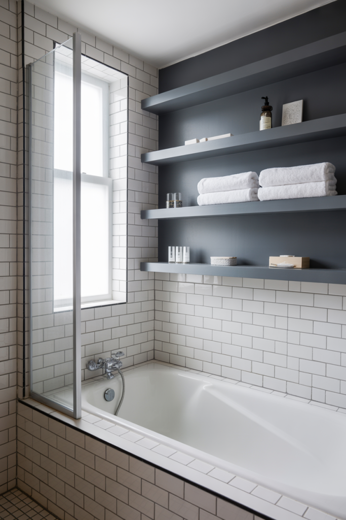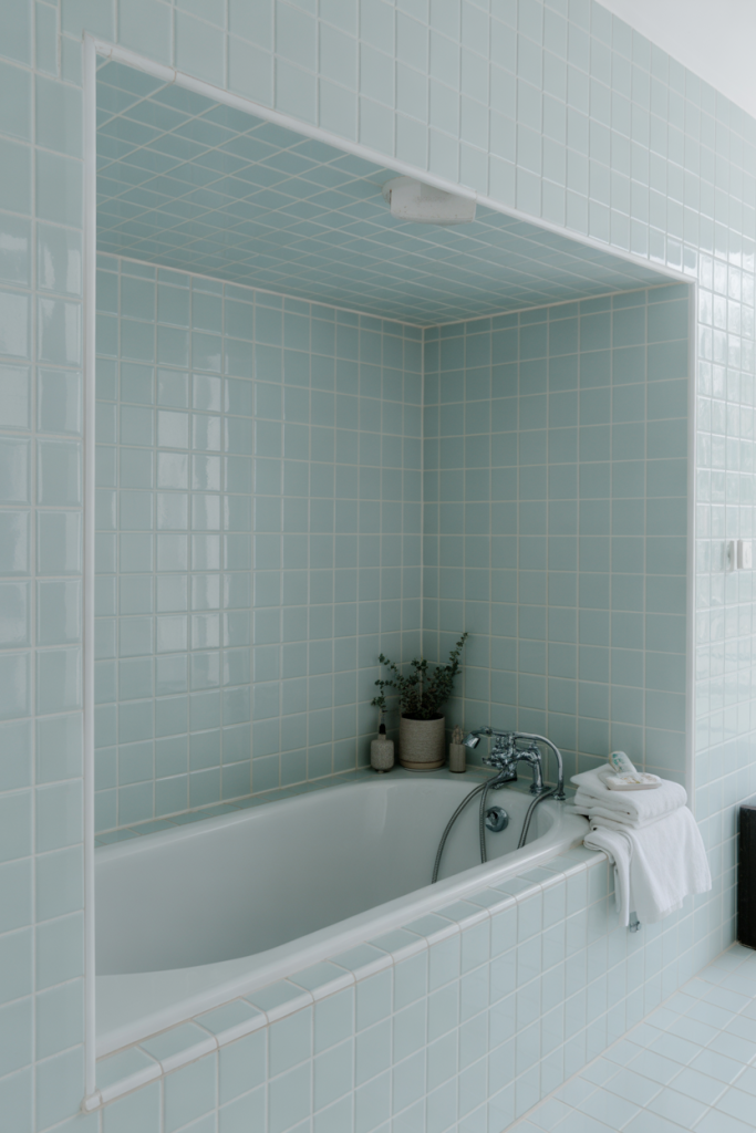 A shallow tub niche painted in soft blue instantly adds charm to a compact washroom. Pair the alcove with a slim tub, light decor and touches of white to keep the mood uplifting. This approach suits UK homes where small recesses are common in older builds.