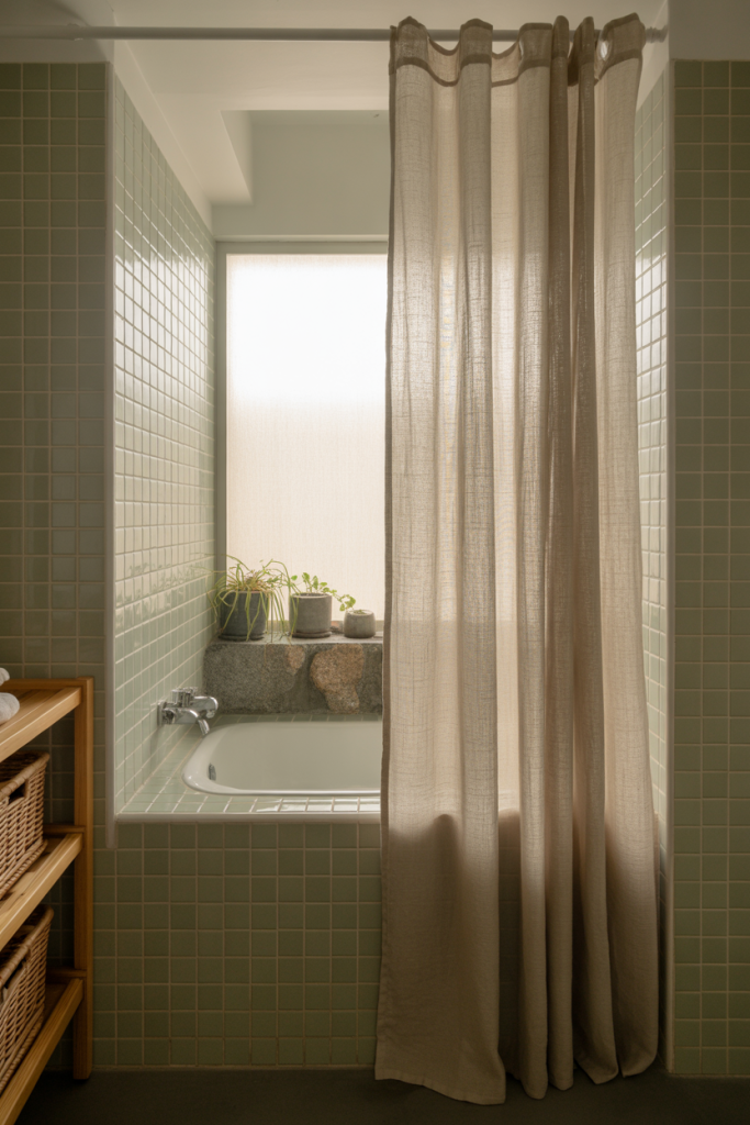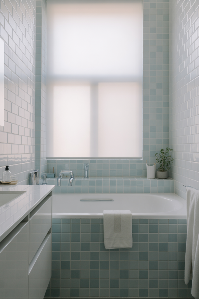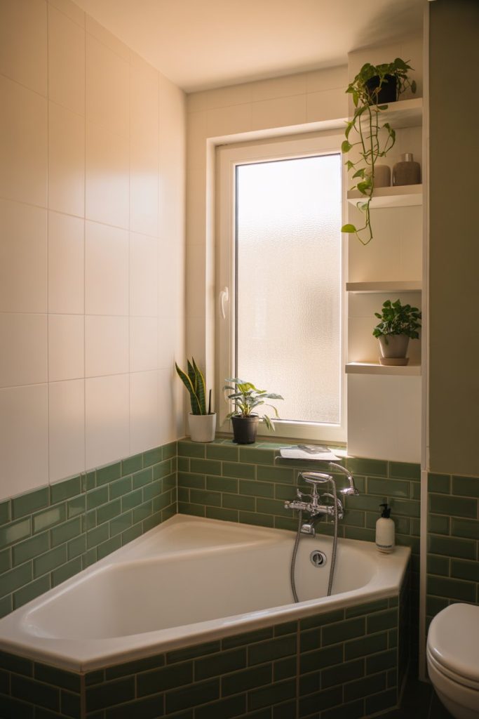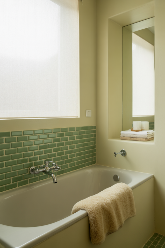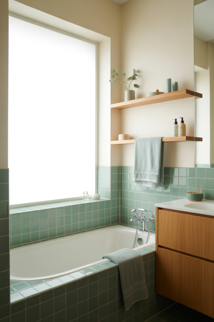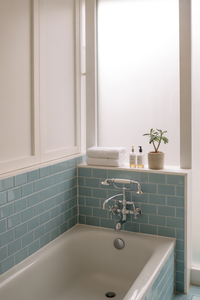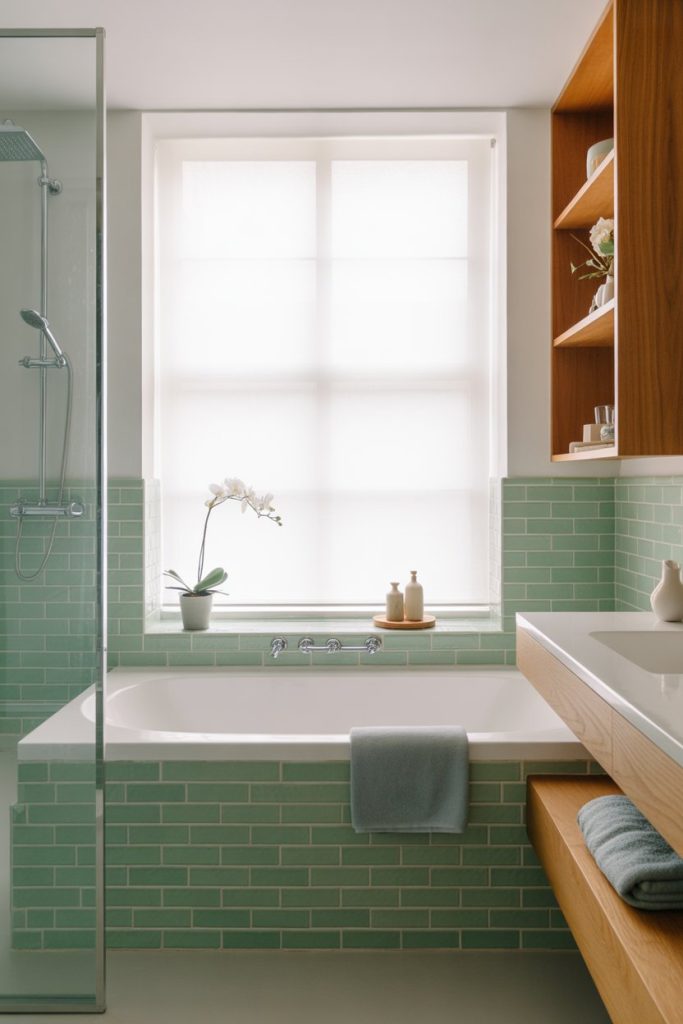 A slender strip of green tile behind the tub adds personality without crowding the room. Match it with soft decor and touches of white to keep things airy. Ideal for spaces that need a focal point but can’t handle strong contrasts.
