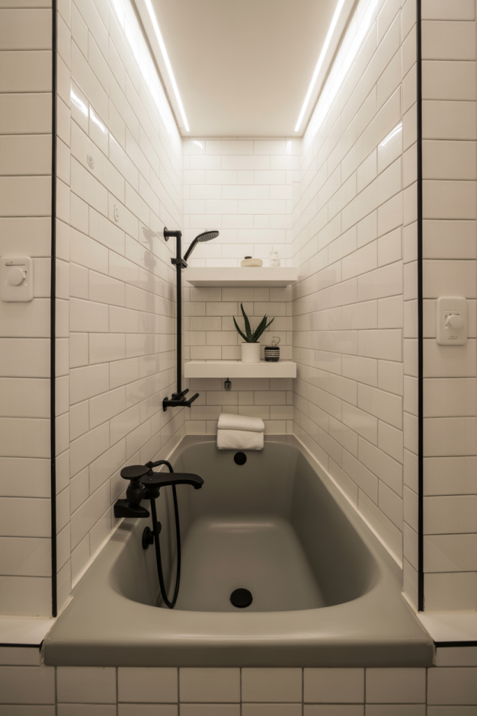 A long, narrow bathroom benefits from gentle contrast around the tub. Pair slim silhouettes with muted black fixtures and touches of decor. Adding a hint of white helps widen the visual field, perfect for compact UK homes.