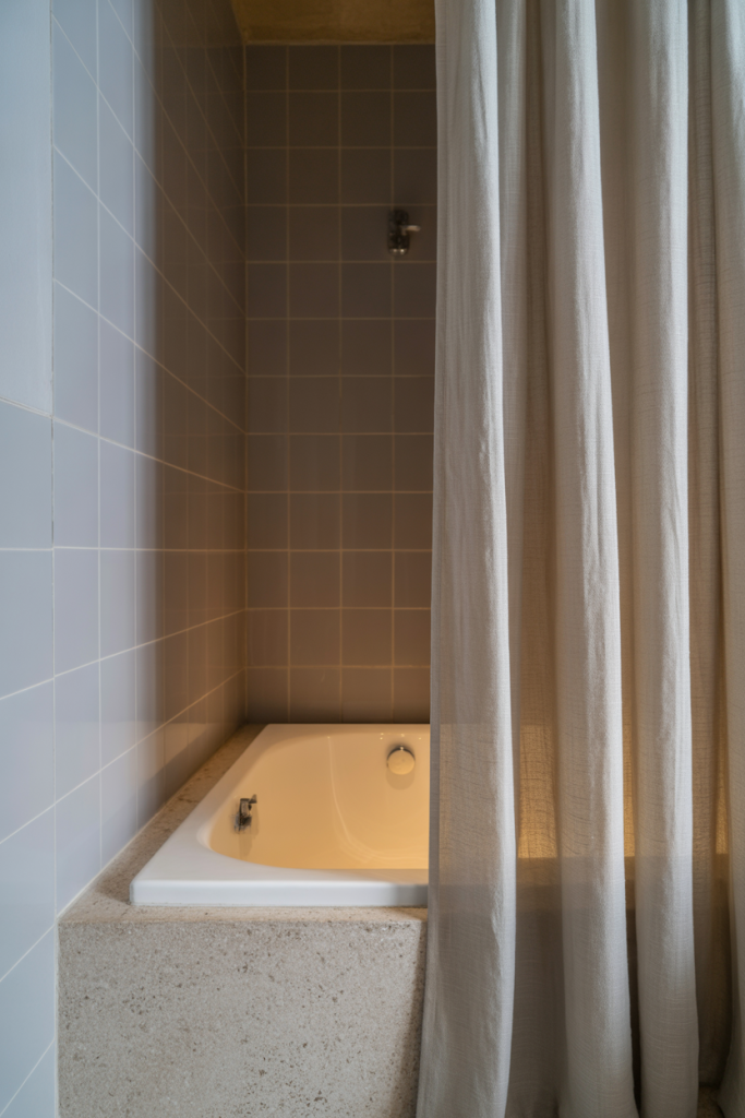 If you have a corner perfect for a small tub, let delicate grey tones define it. Add light decor with natural textures and a simple shower curtain to maintain softness. This look works beautifully in older terraced houses where walls rarely align evenly.