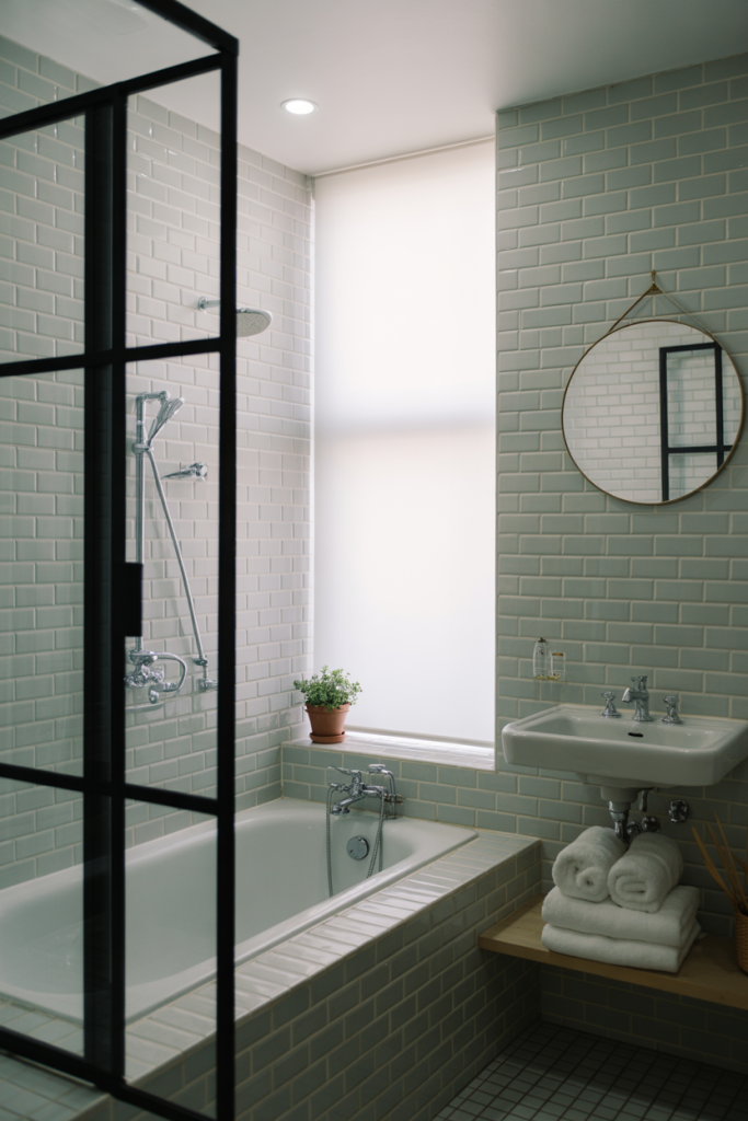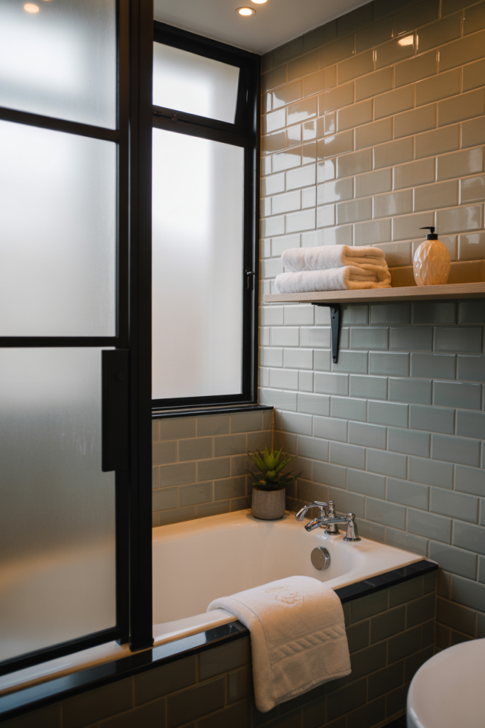 Black-framed shower panels add sharp definition beside a compact tub. Blending black accents with pale tub tile keeps the balance refined. Light touches of decor soften the otherwise crisp geometry, creating a contemporary boutique mood.