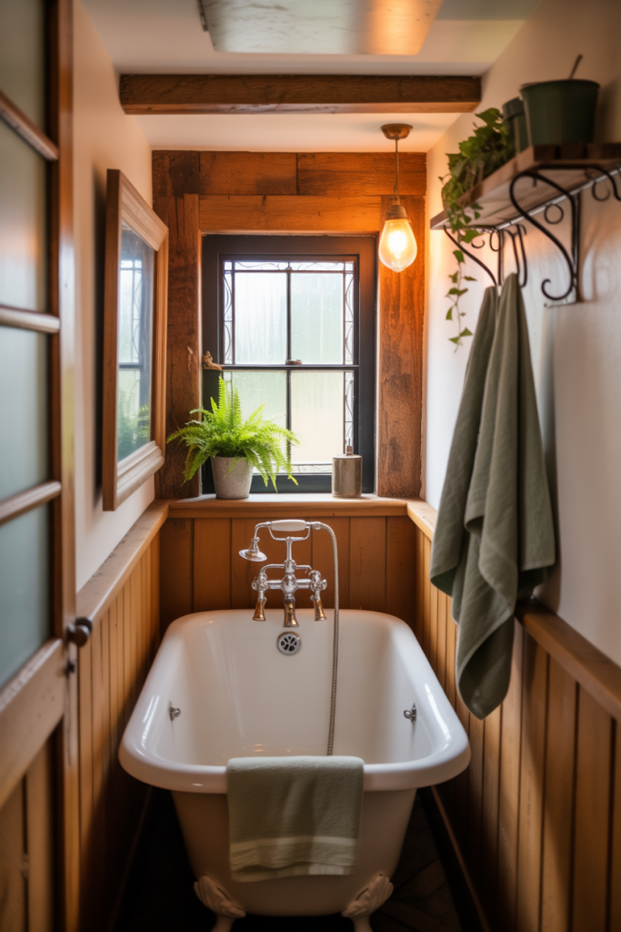 A warm farmhouse rustic palette brings comfort to a small full bathroom. Use soft woods around the tub, subtle decor and muted green accents for natural harmony. This combination works beautifully in countryside homes or UK coastal cottages.
