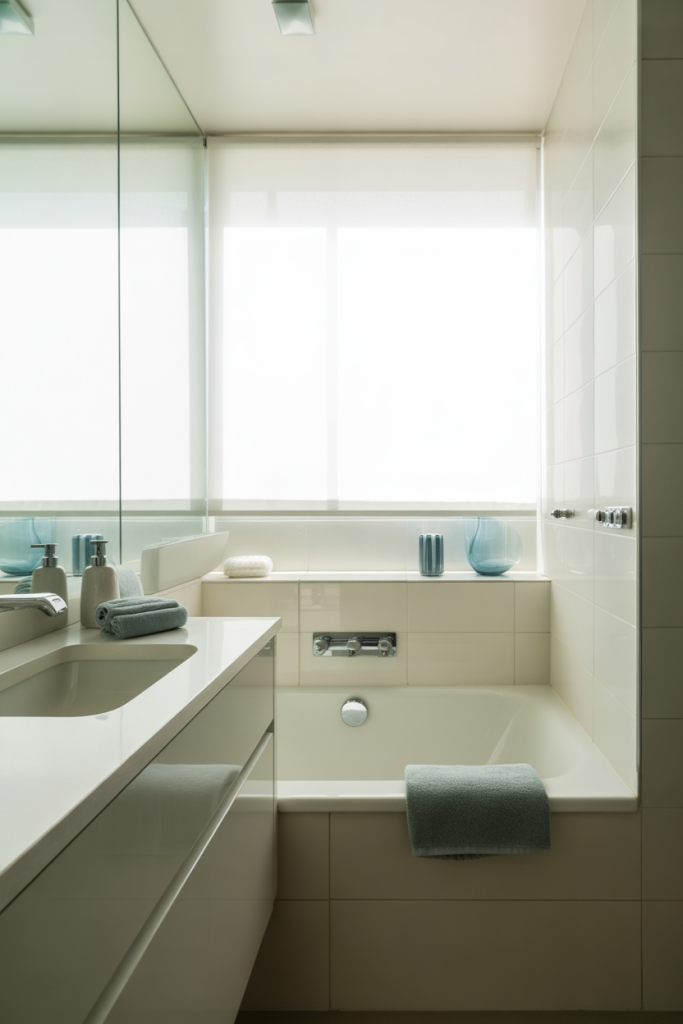 A sleek white vanity can brighten even the smallest wash space when paired with a compact tub. Add soft decor and light reflective surfaces, and consider a hint of blue to soften starkness. This creates a clean, edited look suited for UK new-builds.