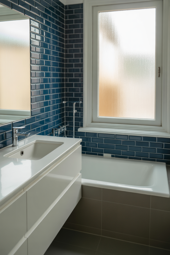 An accent wall of rich blue tiles introduces depth without overwhelming a compact layout. Pairing it with a subtle tub tile pattern and a clean-lined white vanity creates a balanced look. Touches of decor in warm neutrals keep the palette grounded and inviting.