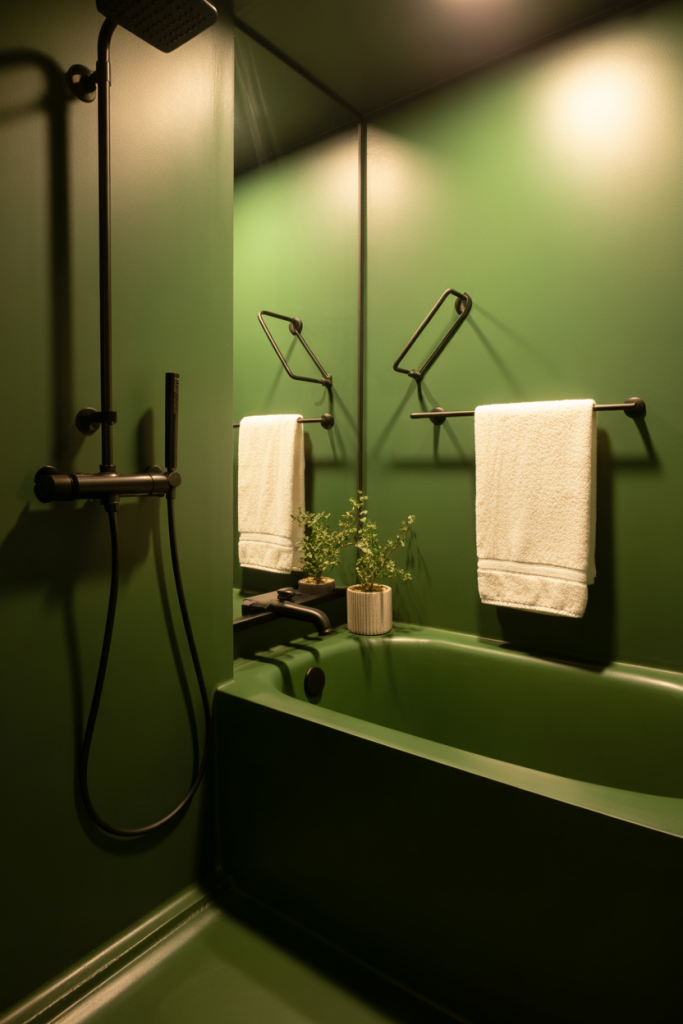 A blend of deep green walls and sleek black fixtures creates a boutique feel in a compact bath. A simple tub grounded by minimal decor prevents the palette from feeling overpowering. Ideal for narrow UK bathrooms needing quiet sophistication.
