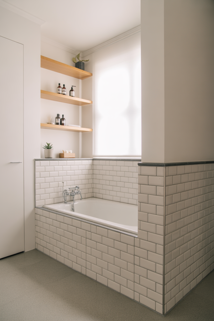 Refreshing the tub tile zone with layered white textures creates instant clarity in a tight room. Add subtle decor and slim shelving to keep things organised. A hint of grey keeps the palette grounded and works well in contemporary UK layouts.