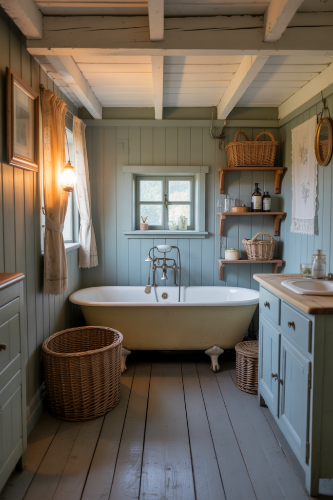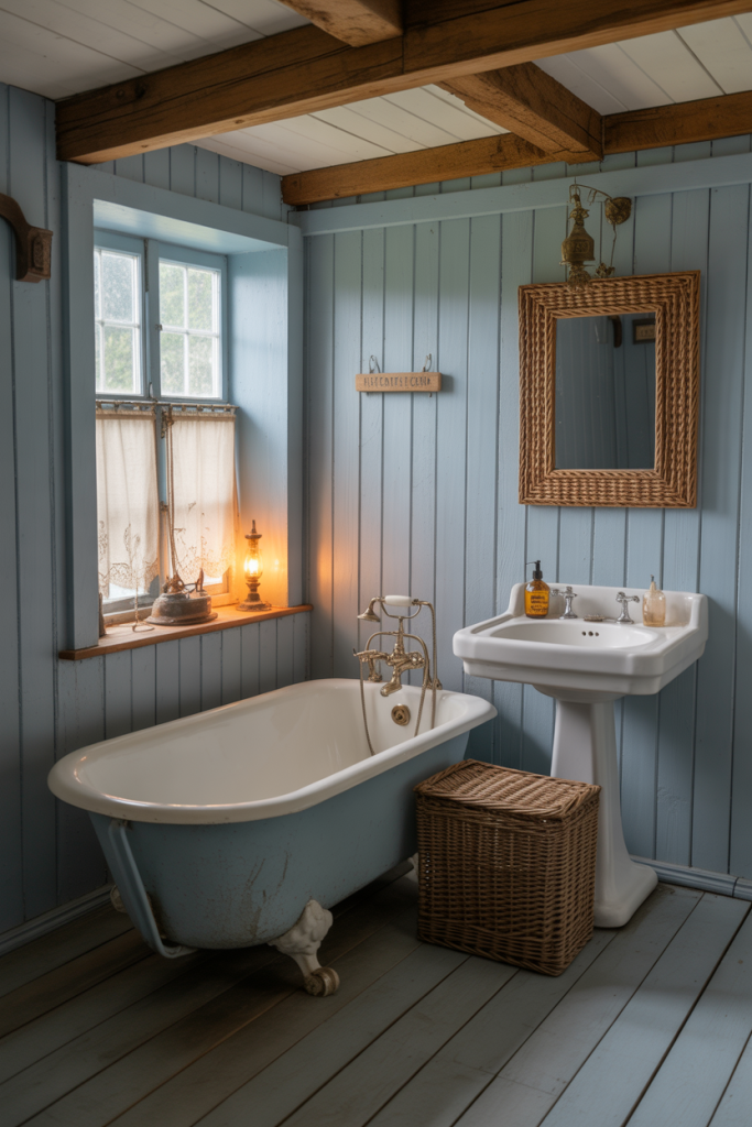 A soft blue scheme combined with gentle farmhouse vintage touches brings cottage warmth to a small bathroom. A slim tub paired with handcrafted decor like wicker baskets or ceramics enhances the charm. Perfect for countryside homes or small annex baths.