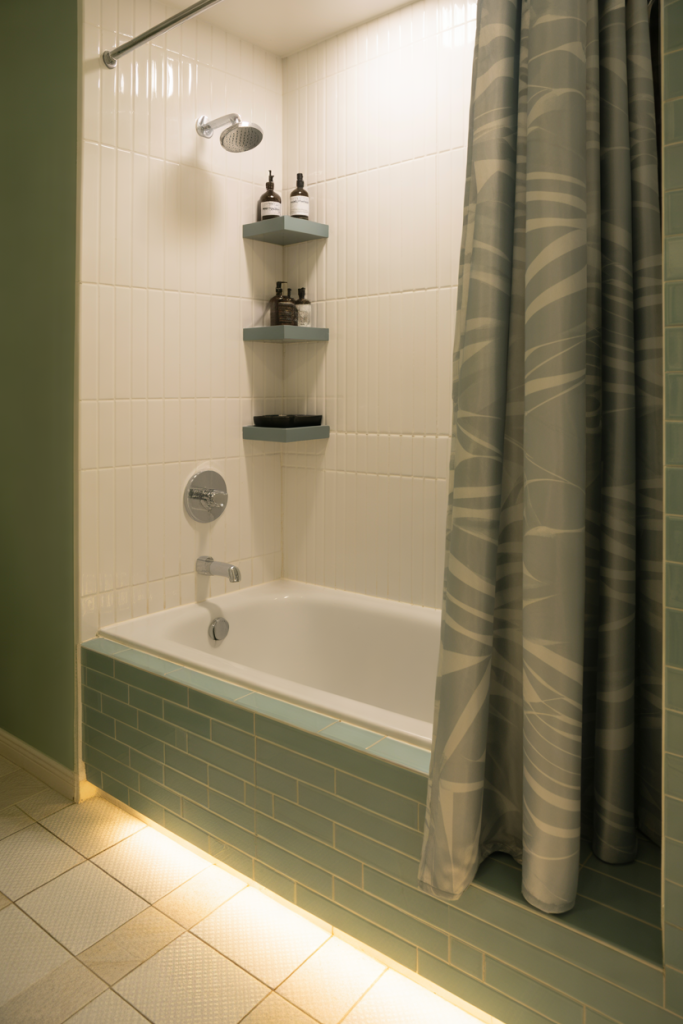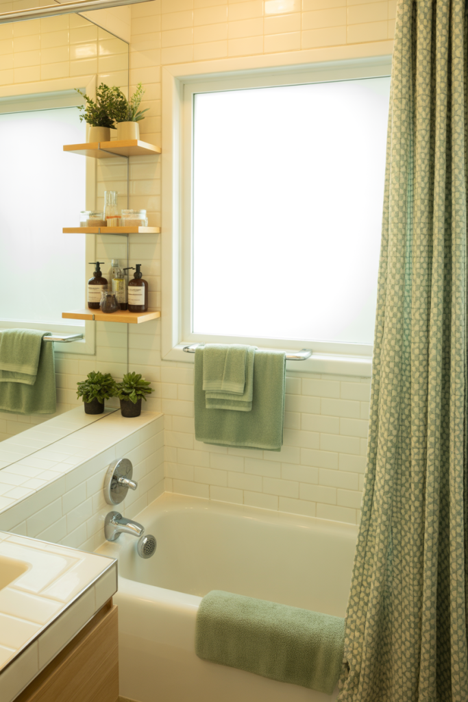 A well-designed tub shower combo is ideal for tight layouts, offering versatility without sacrificing comfort. Pair it with slim shelving, soft lighting and a modern shower curtain. Adding subtle green accents lifts the space and keeps it feeling refreshed.