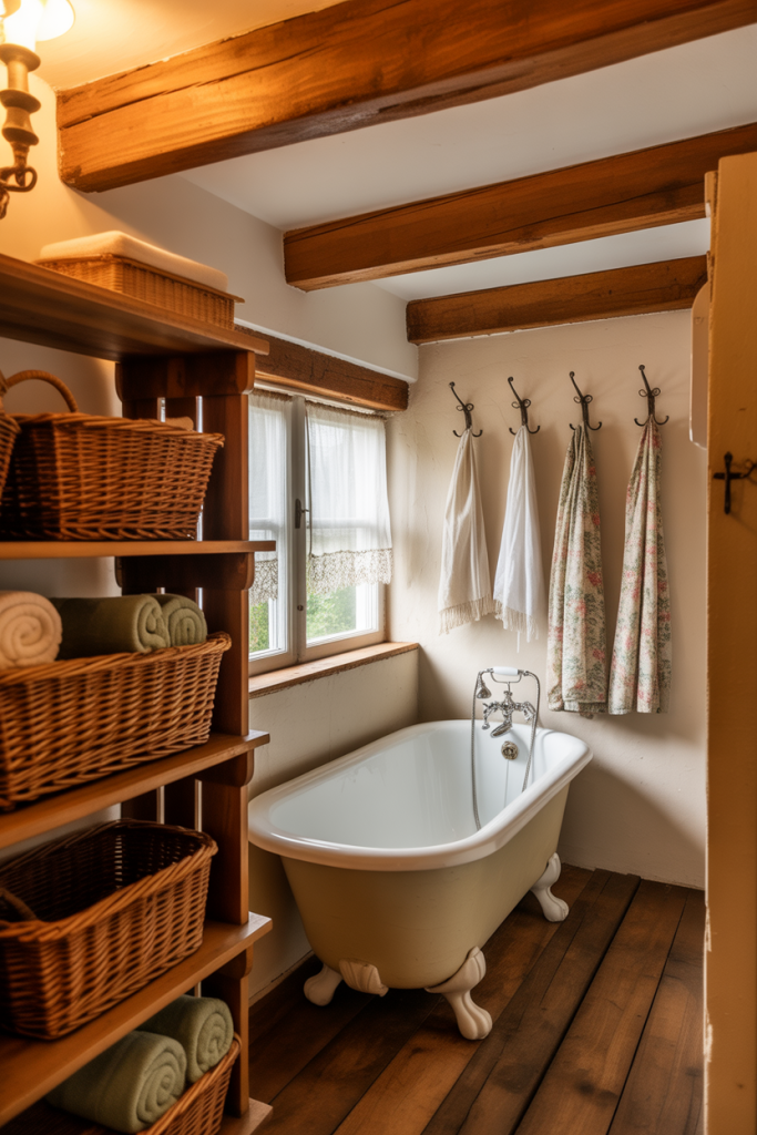 This idea layers classic farmhouse vintage details with a functional full bath layout. A compact tub, warm woods and soft white tones create an enduring look. Touches of decor like metal hooks or woven baskets reinforce the rustic charm.