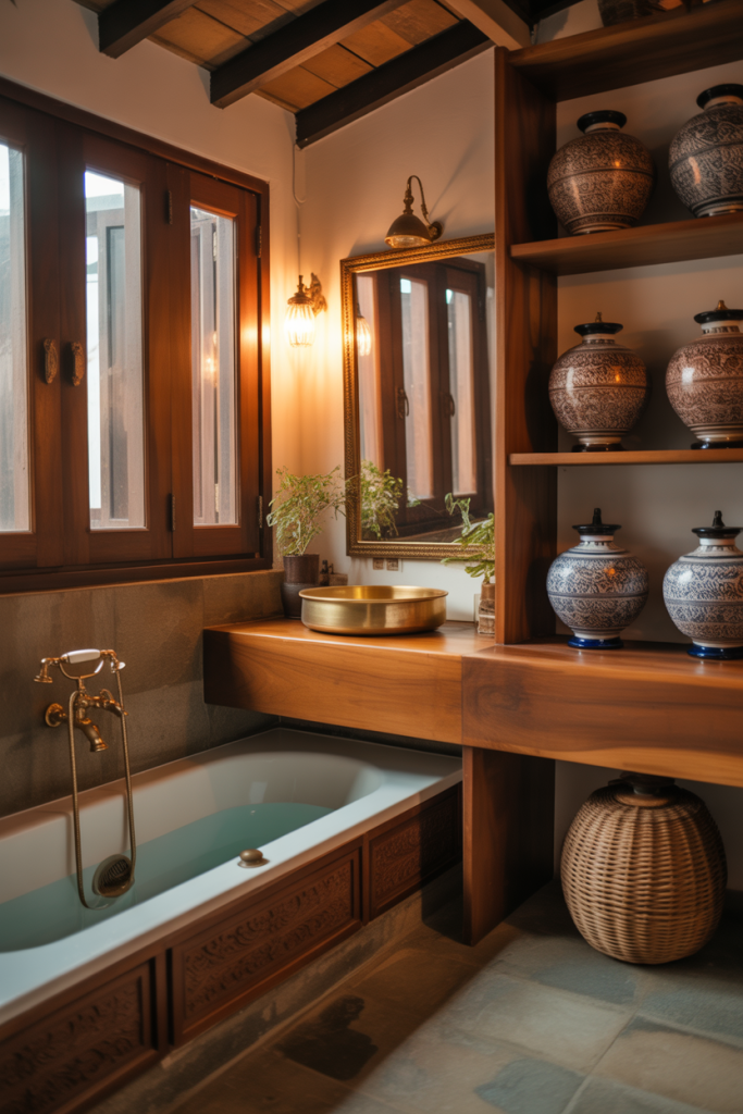 A blend of Indian textures and farmhouse rustic materials delivers warmth and global charm. A compact tub, carved wood accents and earthy tones enrich the space. Subtle decor—like patterned pottery or brass—adds personality without overwhelming the room.
