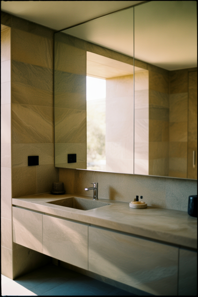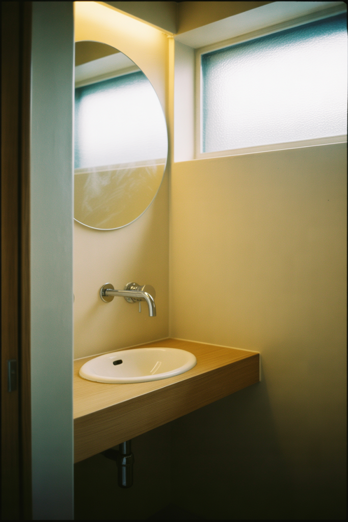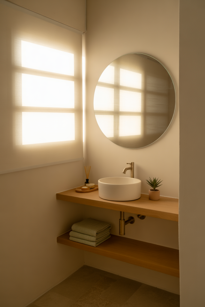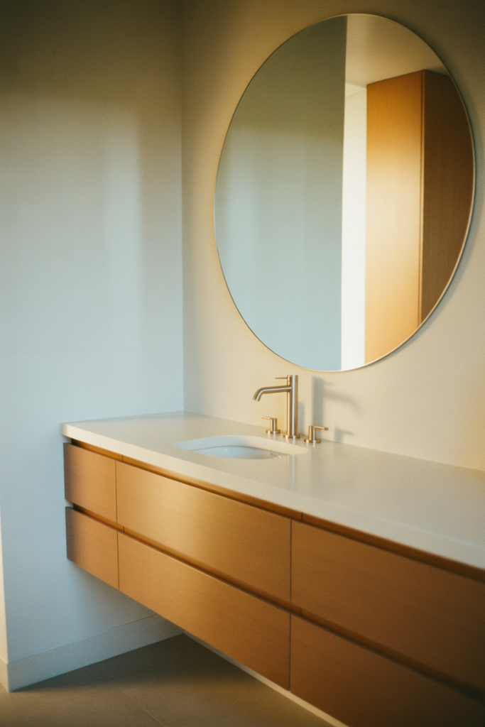 A budget-conscious insight is that softness comes from form, not cost. Rounded mirrors, curved faucets, and warm bulbs create charm without requiring expensive materials.