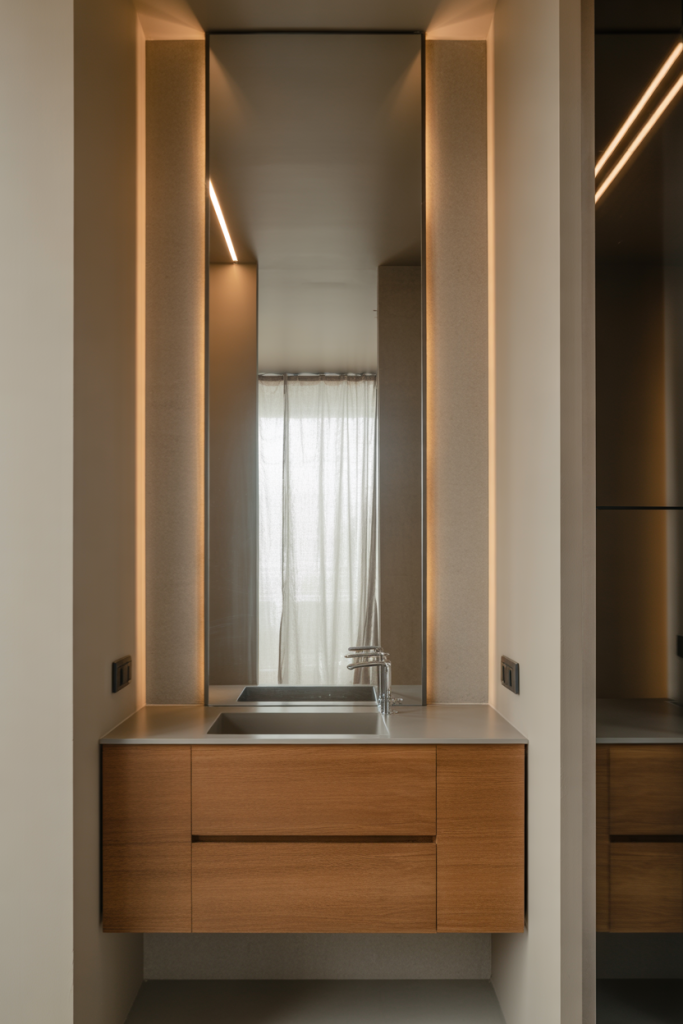 Some half baths are tucked into tight hallway corners, but design can still shine. Combining a narrow layout with minimalist lines and elegant finishes transforms a tricky footprint into a refined space that feels planned rather than leftover.