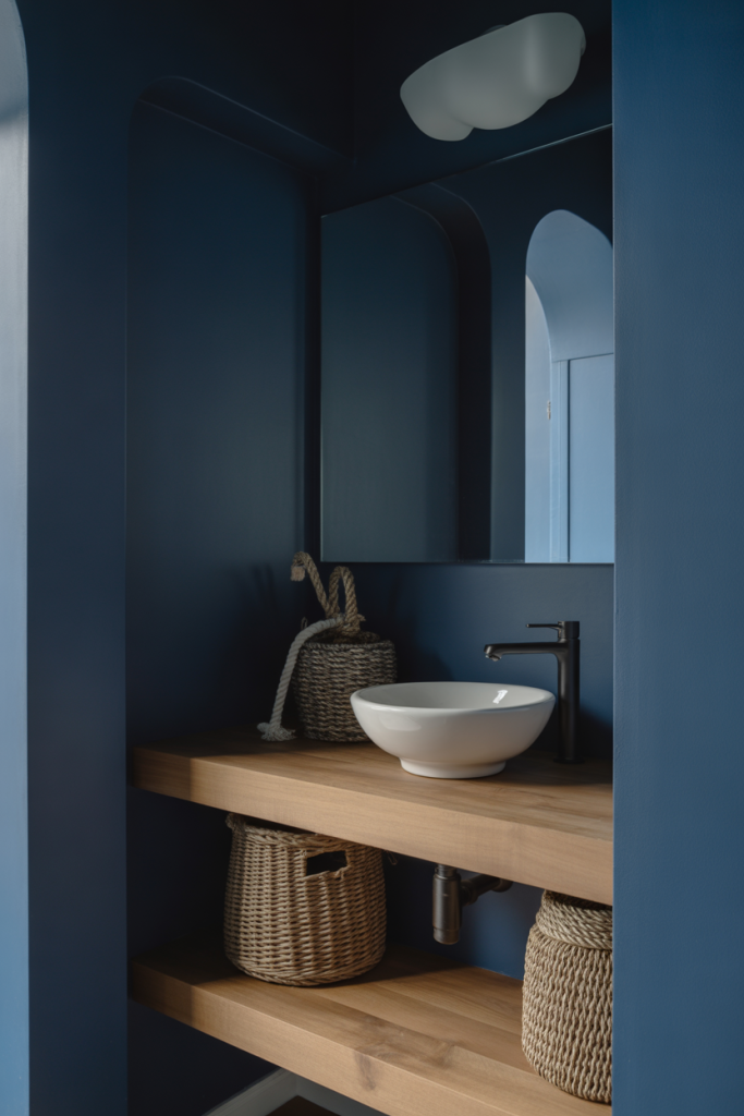 Coastal style doesn’t have to be light and breezy. A deeper take blends dark tones with coastal textures and slightly moody lighting, creating a grounded, sophisticated half bath that still feels relaxed.