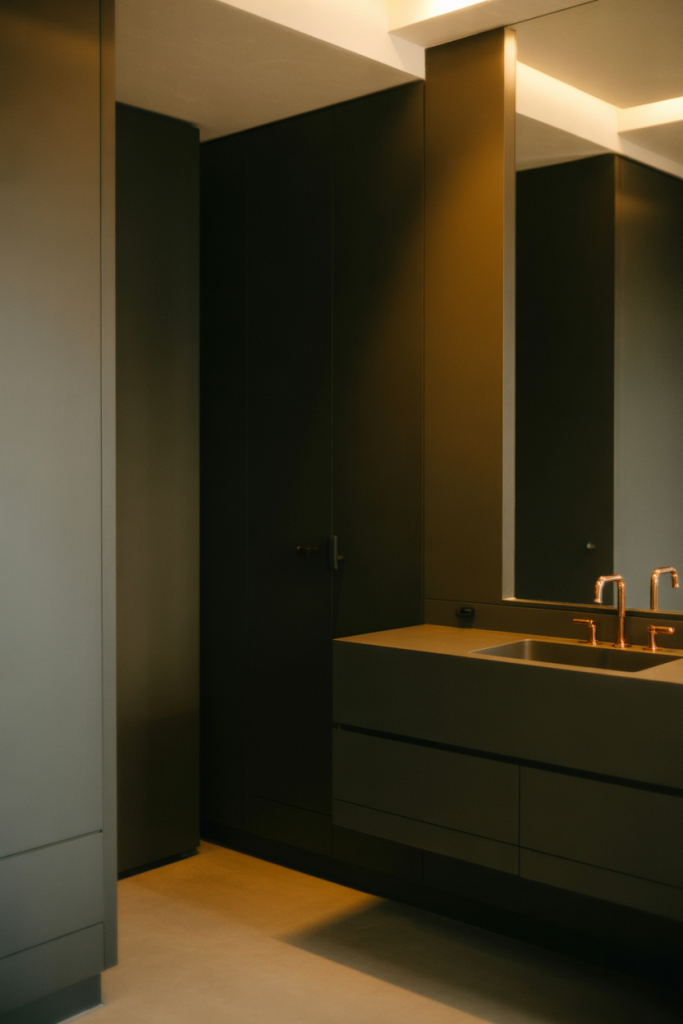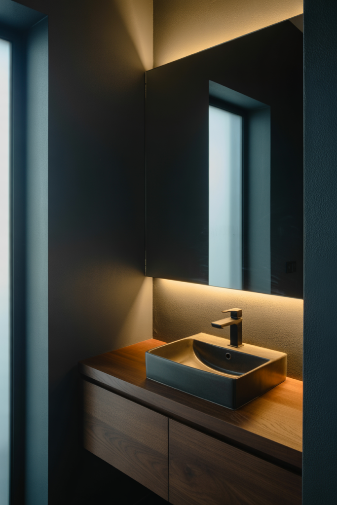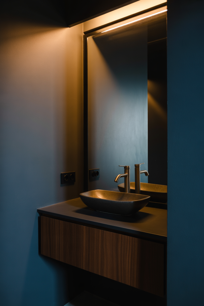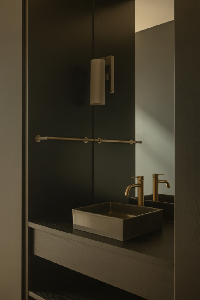 From an expert-style perspective, darker palettes work best when paired with reflective surfaces. Glossy tiles, metallic fixtures, or a softly lit mirror prevent the space from feeling flat, allowing shadows and highlights to coexist in a balanced way.