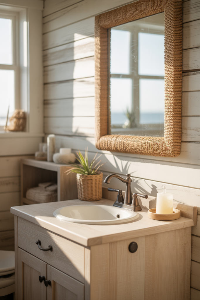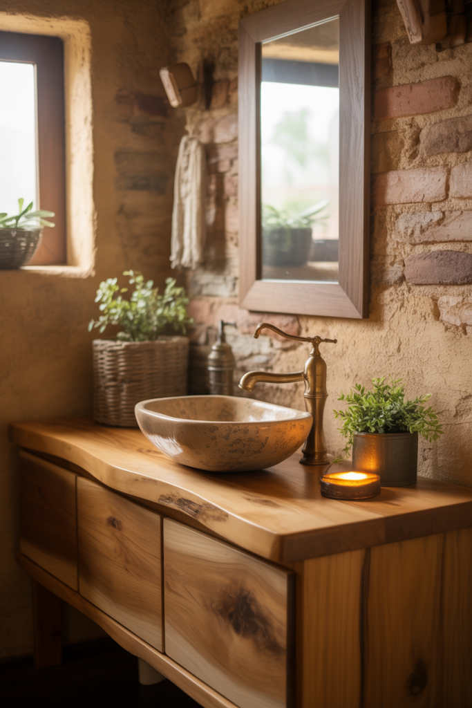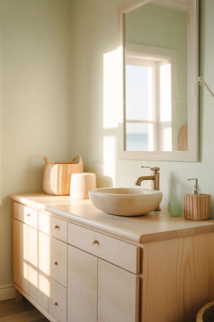 Blending rustic textures with a relaxed coastal vibe creates a half bath that feels grounded and fresh. Soft woods, organic shapes, and hints of green bring the outdoors in, making the space feel calm and approachable rather than overly styled.