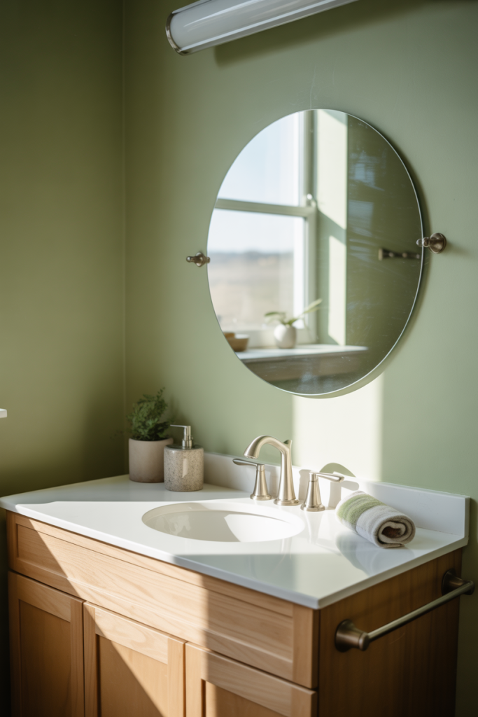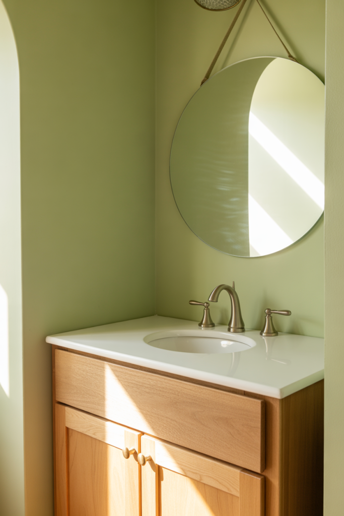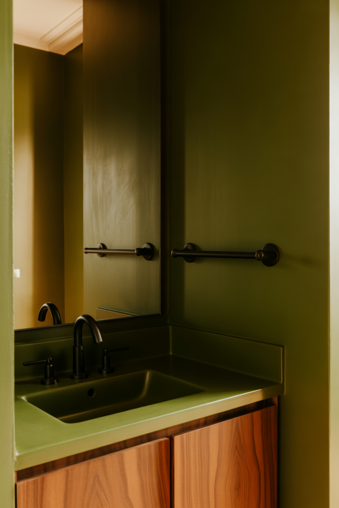 A practical insight is to choose green with warm undertones. Cooler shades can feel sterile under artificial light, while warmer greens stay flattering day and night, especially in windowless half baths.