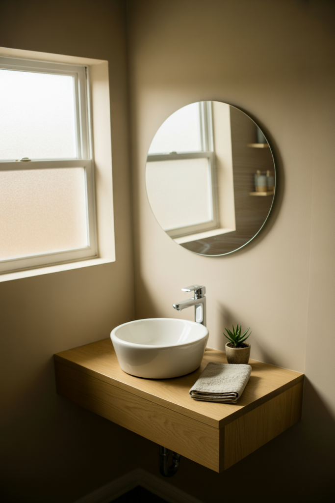 A cute half bath doesn’t need clutter. By combining minimalist structure with gentle curves and warm finishes, the space feels friendly yet composed. Small details do the emotional work without overwhelming the room.