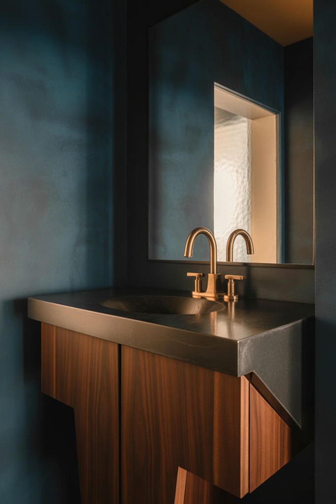 Using dark colors along with refined structure gives depth to a half bath. When soft modern lines and small contrasts are paired thoughtfully, they create a space that feels intentional, mature, and quietly confident, rather than overwhelming.