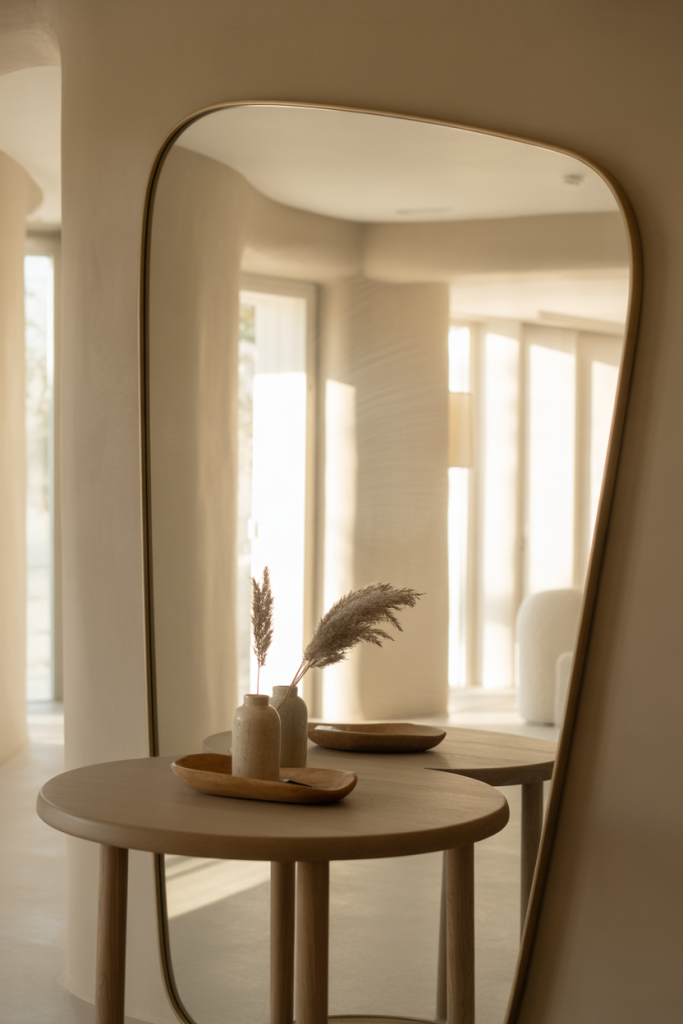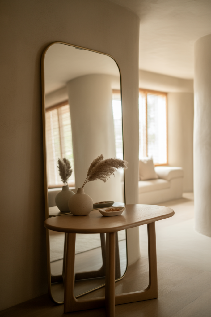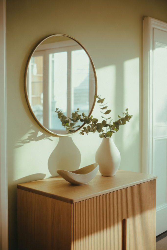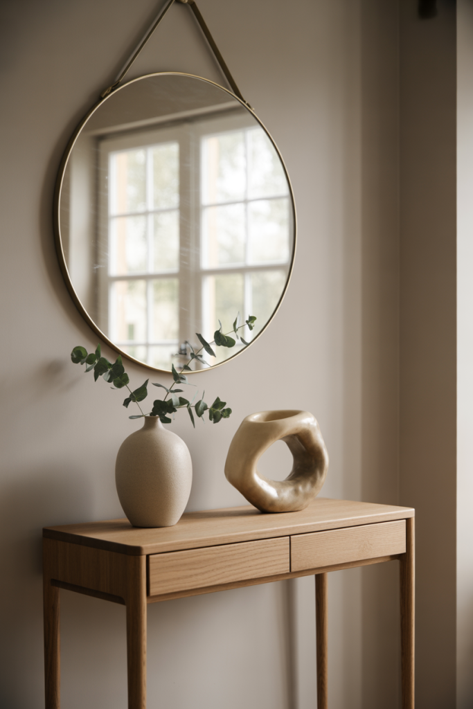 Pairing a round entry table with a soft-edged mirror creates visual harmony in tight spaces. This combination reduces harsh lines and encourages flow, making the entry feel calmer and more intentional.
