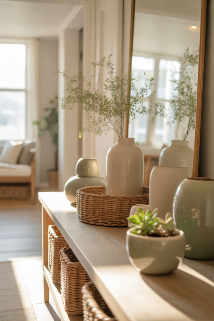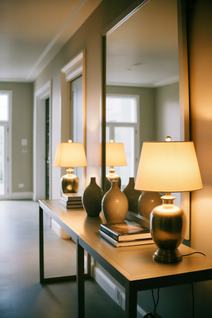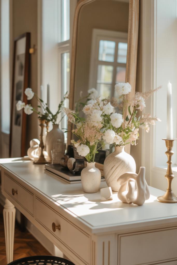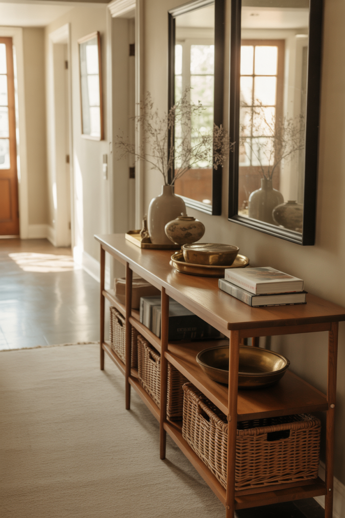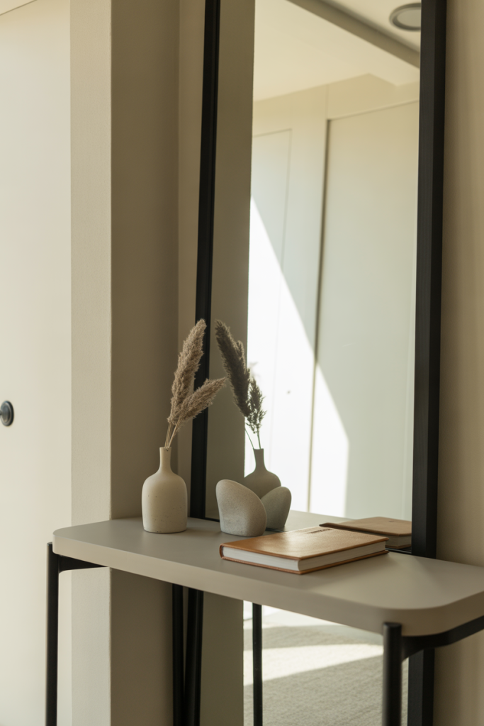 An expert-style approach here is to think in vertical layers. Designers often recommend anchoring the mirror slightly lower than eye level to visually connect the table and wall. This prevents the setup from floating awkwardly and makes the entire entry feel cohesive rather than like separate pieces competing for attention.