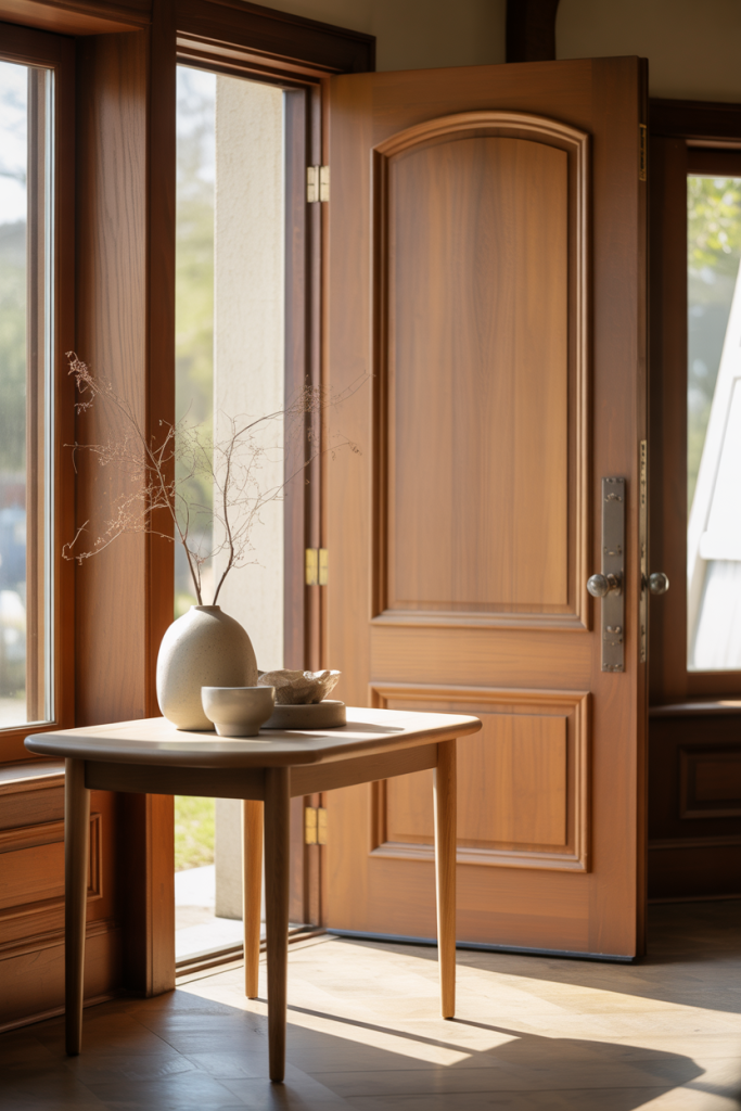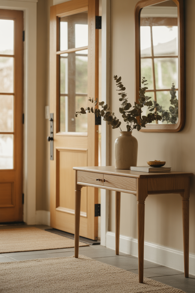 Some entries naturally frame the front door as a focal point, and the table should support that view rather than compete with it. Using balanced ideas and subtle, simple accents helps guide the eye toward the door while still offering function for daily essentials.