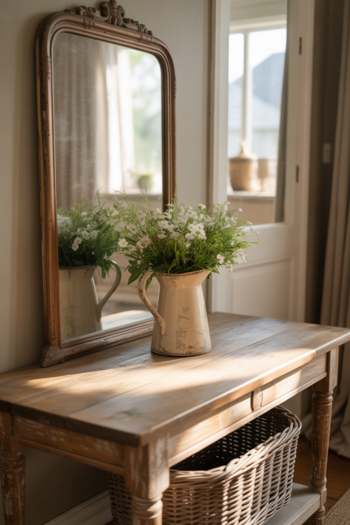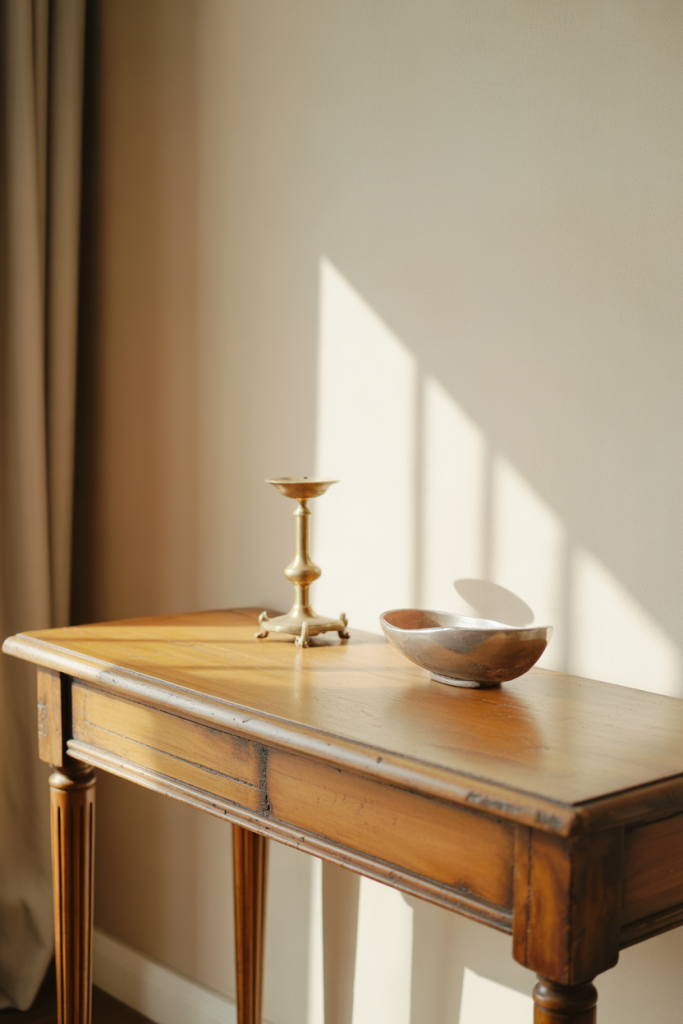 An entry table with an antique accent brings character without overwhelming the space. Paired with restrained ideas and neutral surroundings, an aged mirror, box, or lamp becomes a quiet storyteller rather than a statement piece fighting for attention.