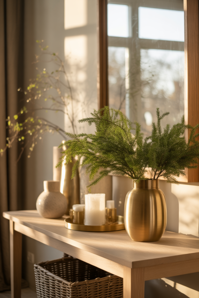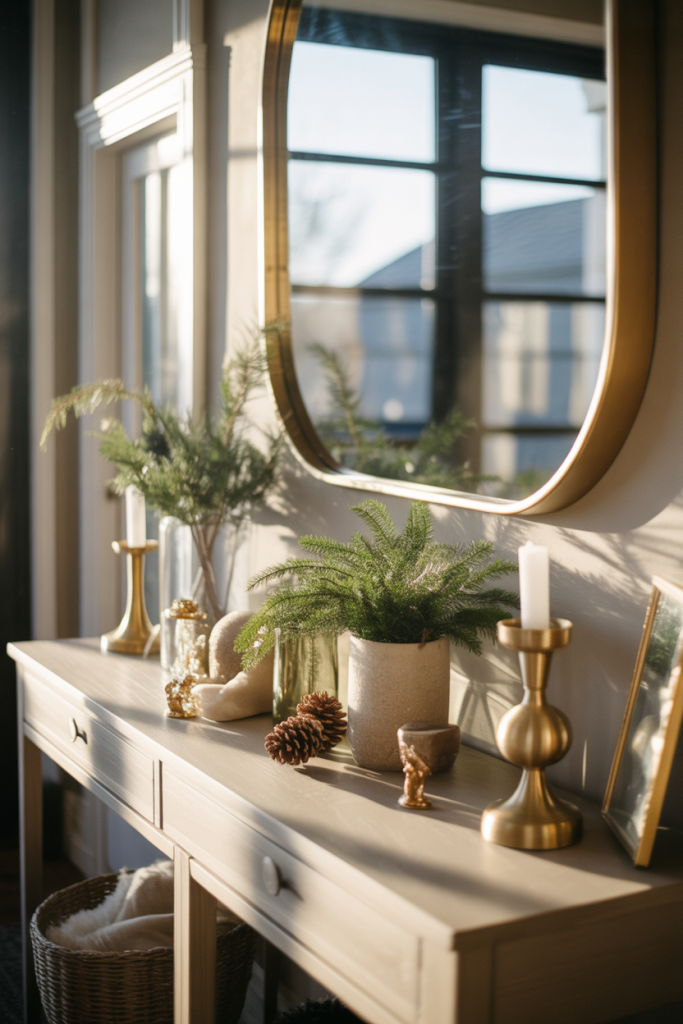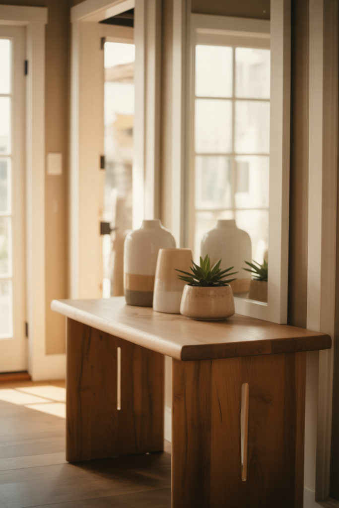 A modern entry table styled around a statement mirror instantly sets a confident tone. Clean lines, layered textures, and a thoughtful balance of modern, mirror, and simple elements make the space feel intentional rather than staged. This idea works especially well in narrow foyers where reflection adds depth and light without visual clutter. The goal is restraint, letting a few well-chosen objects do the heavy lifting.