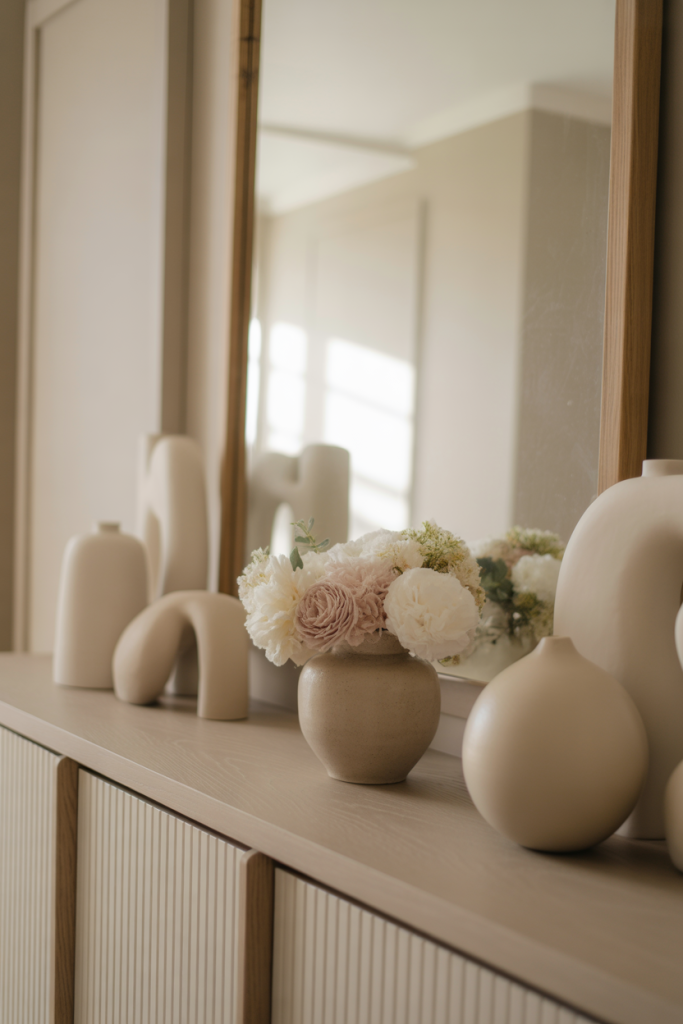 Drawing from wedding aesthetics, soft neutral entry tables feel refined yet approachable. Light textures, gentle curves, and minimal contrast create an atmosphere that feels calm rather than ceremonial.