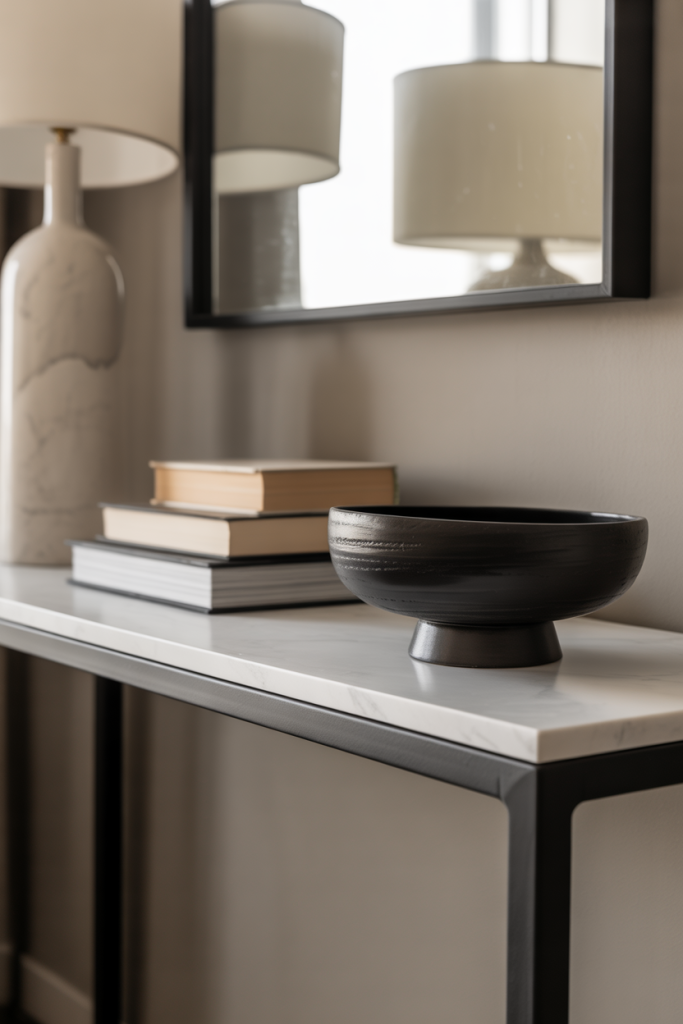 High-contrast entry table decor is having a moment, especially in homes that lean graphic and bold. Using black, white, and clean ideas creates instant polish without relying on trends. A monochrome palette allows sculptural shapes, books, and natural materials to stand out while keeping the entry calm and uncluttered.