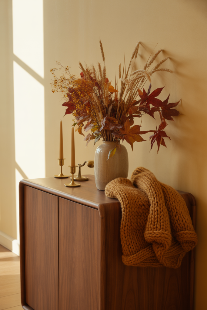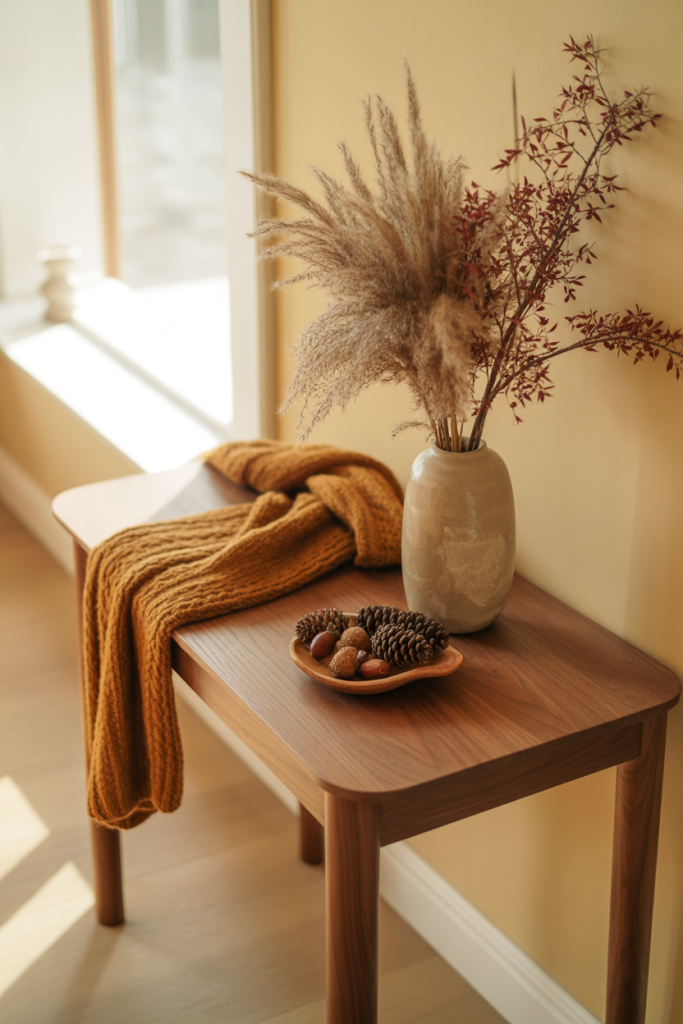 Warmth, rather than a theme, is what entry tables for Thanksgiving are about. Together, Thanksgiving touches and timeless front styling offer a welcome mood that doesn’t feel like it’s only for a season. Earthy tones, textures, and gentle layers do the work.