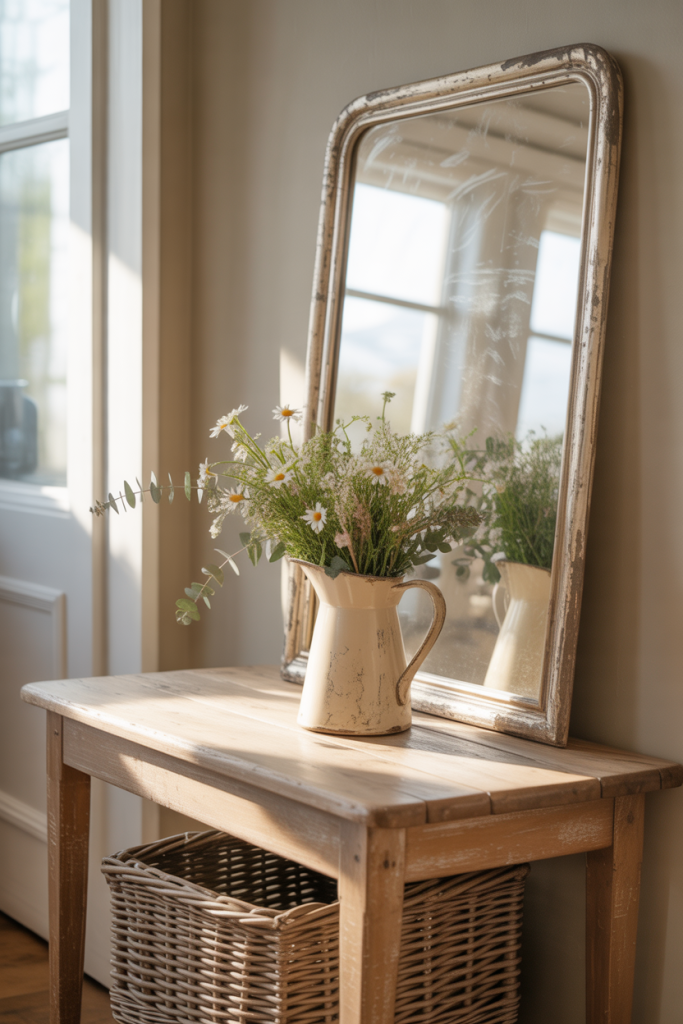 Farmhouse entry table decor remains popular, but in 2026 it feels softer and more refined. Mixing farmhouse, antique, and front elements creates warmth without feeling dated. Natural wood, aged finishes, and simple florals help the entry feel welcoming and lived-in rather than themed.