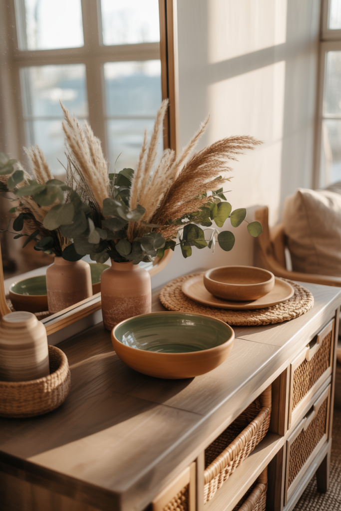 Western-inspired entry tables feel grounded and tactile. By mixing Western elements with restrained Boho touches, the space feels relaxed rather than themed. Natural leather, raw wood, and simple ceramics create warmth that reads effortlessly American.