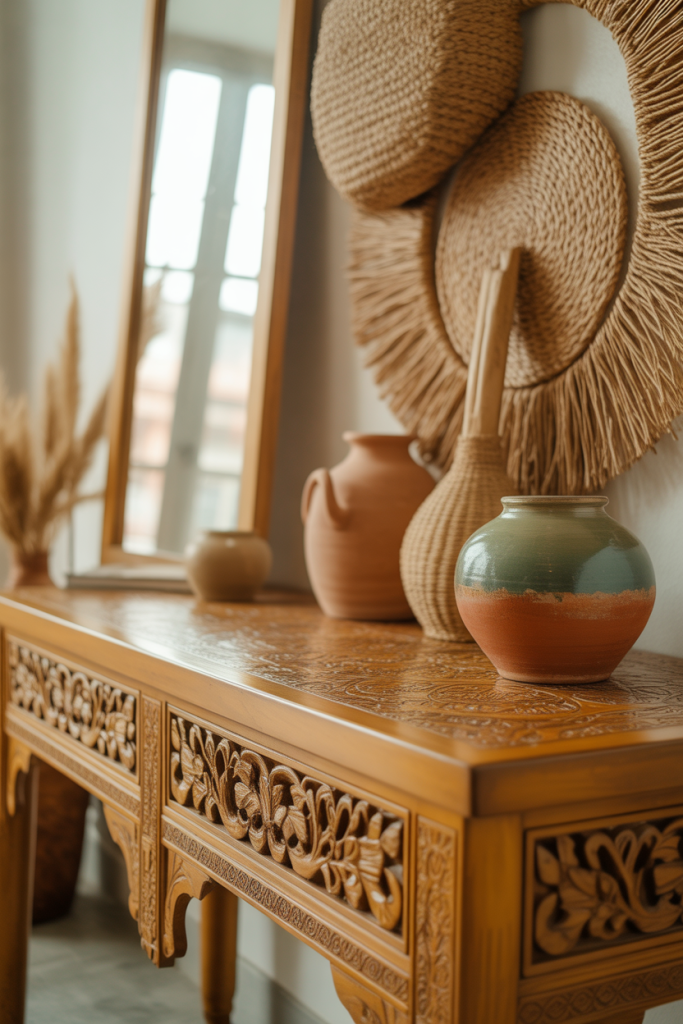 Boho entry tables shine with texture and styling personality. The blend of boho, Western, and relaxed ideas gives warmth without the clutter. Collections of natural fibers, ceramics, and the old and new provide an affordable layered styling.