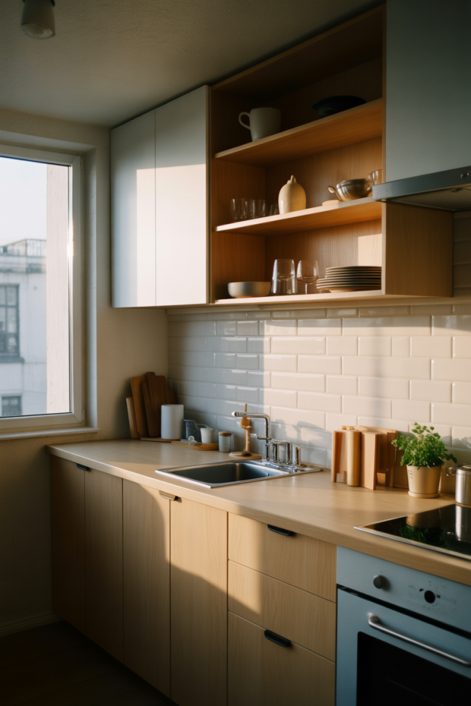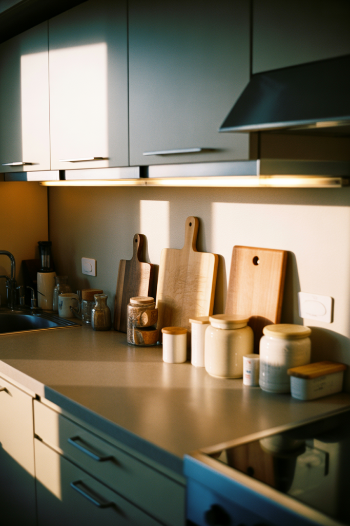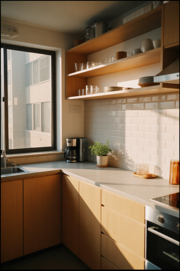 In Apartment Decorating on a Budget 2026, the kitchen benefits from warmth just as much as living spaces. Small additions like wood cutting boards, ceramic jars, and soft lighting turn a basic rental kitchen into a cozy everyday hub.