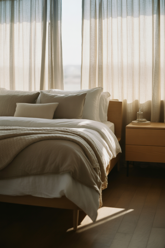 Window treatment options for 2026 rely heavily on budget or comfort, and the style dramatically affects the bedroom. Higher than the window frame, simple curtains made of soft fabric can relieve harsh light and make the frame feel taller.