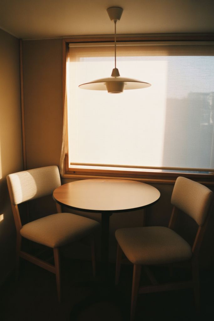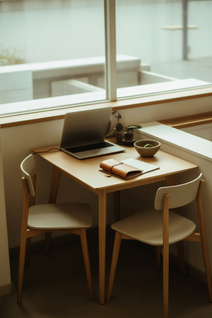This arrangement is ideal by windows or in kitchens, as meals often happen. Modest scaling suggests the area is more intentional than simply ‘fitted in.’