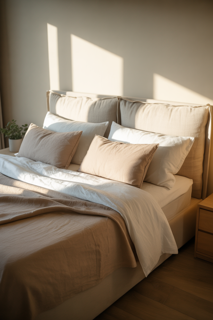 When doing apartment decorating on a budget in 2026, a budget-friendly headboard can completely transform a bedroom. In a bedroom inside a rental, fabric panels, plywood wrapped in fabric, and even wall-mounted soft cushions add design and warmth without the hassle of drilling in large anchors or expensive furniture.