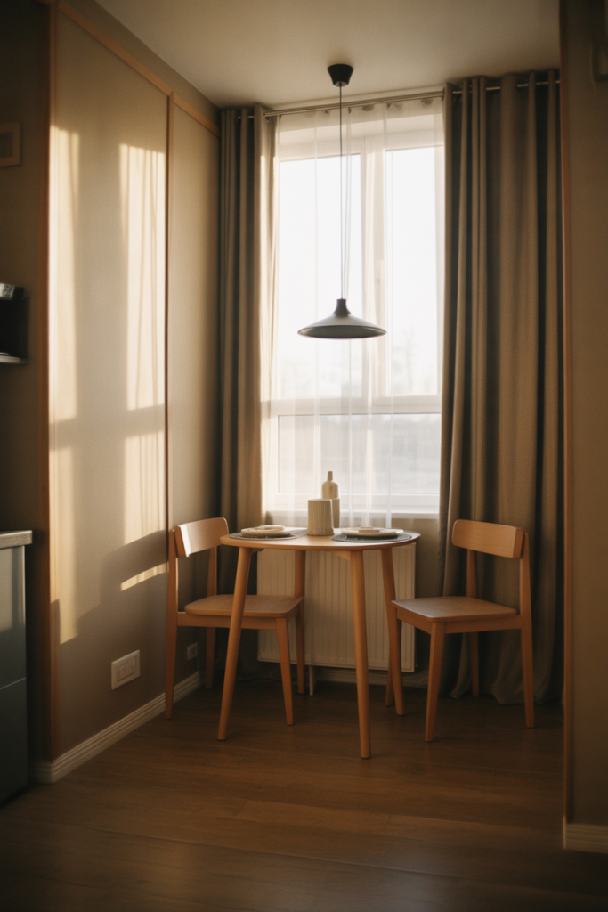 You don’t. Even without a formal dining room, apartment decorating on a budget in 2026 includes a dedicated eating space. A round table and two chairs in a studio or small living room provide a visual dining area without crowding the space.
