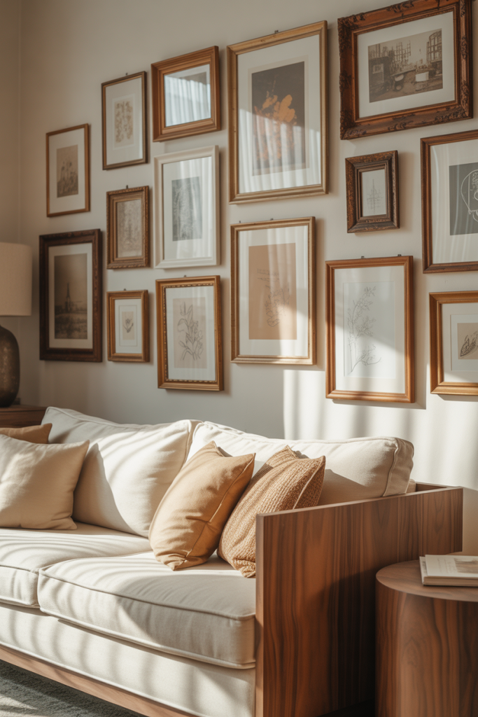 A collected wall of art brings warmth to apartment decorating on a budget in 2026 and works beautifully in a living room where blank walls feel impersonal. Mixing vintage frames, small prints, and found objects creates a layered look that feels curated over time. The key is variety in size and texture, not expensive originals.