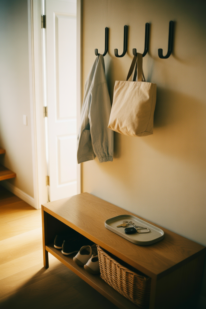 An entryway sets the tone for apartment decorating on a budget in 2026, even in a rented apartment. A Minimalist bench, hooks, and a small tray provide function without clutter, making daily routines smoother from the moment you walk in.
