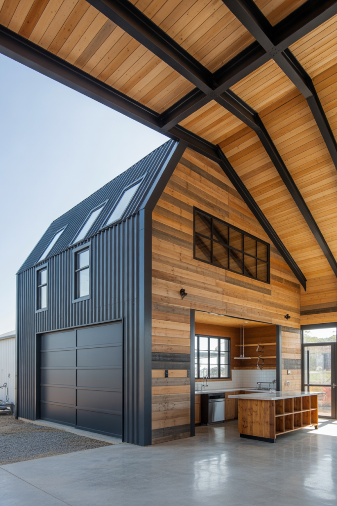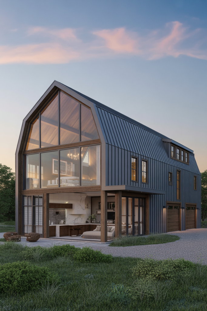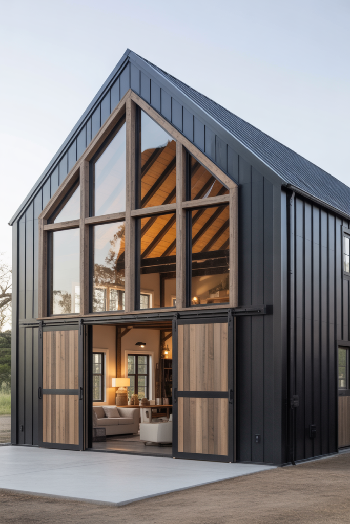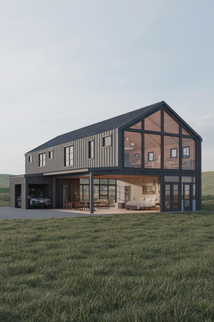 If your ideal home leans toward clean lines and sleek finishes, this idea begins with a modern exterior painted in matte black or charcoal, paired with natural wood siding and glass walls. Inside, open-plan interiors flow seamlessly from the kitchen into the living area, offering a refined yet approachable feel. On the main level, high ceilings draw the eye upward and make the space feel expansive. This style suits those who want a barndominium that feels current and architectural rather than purely rustic.