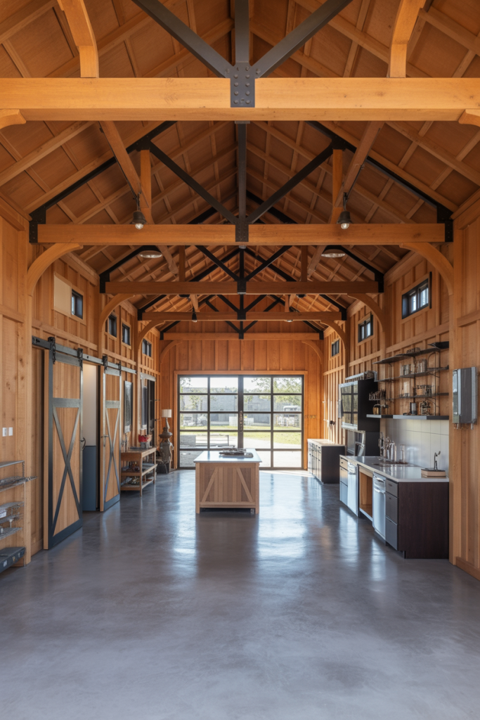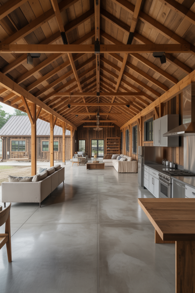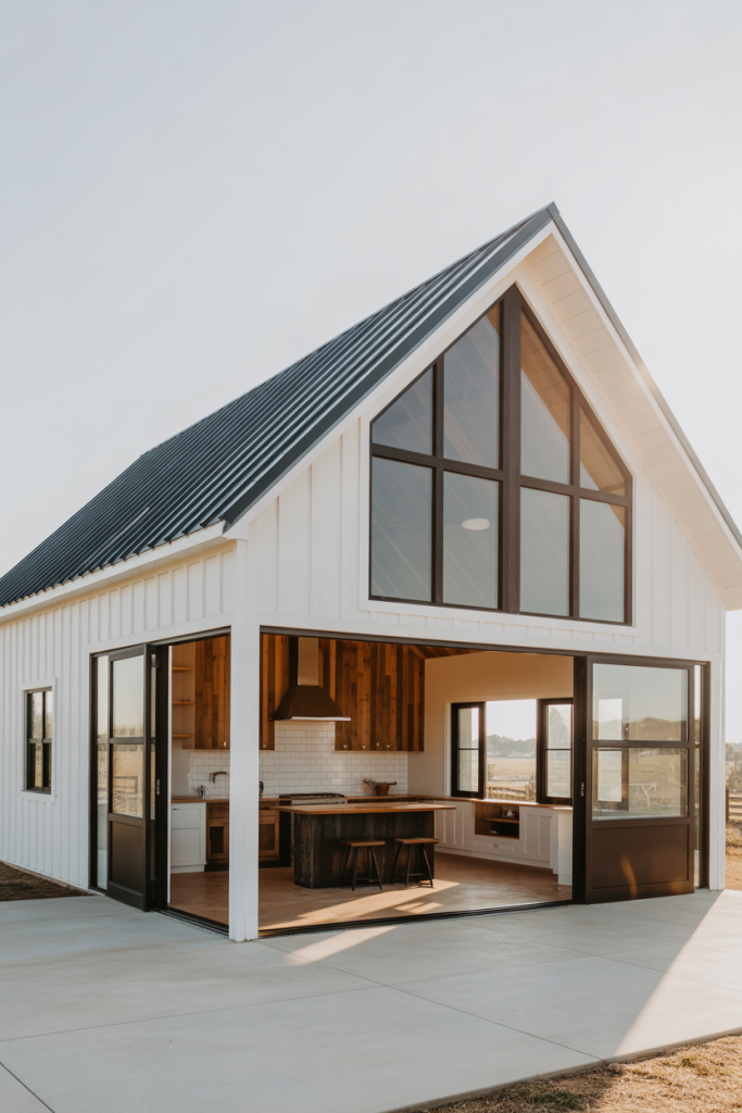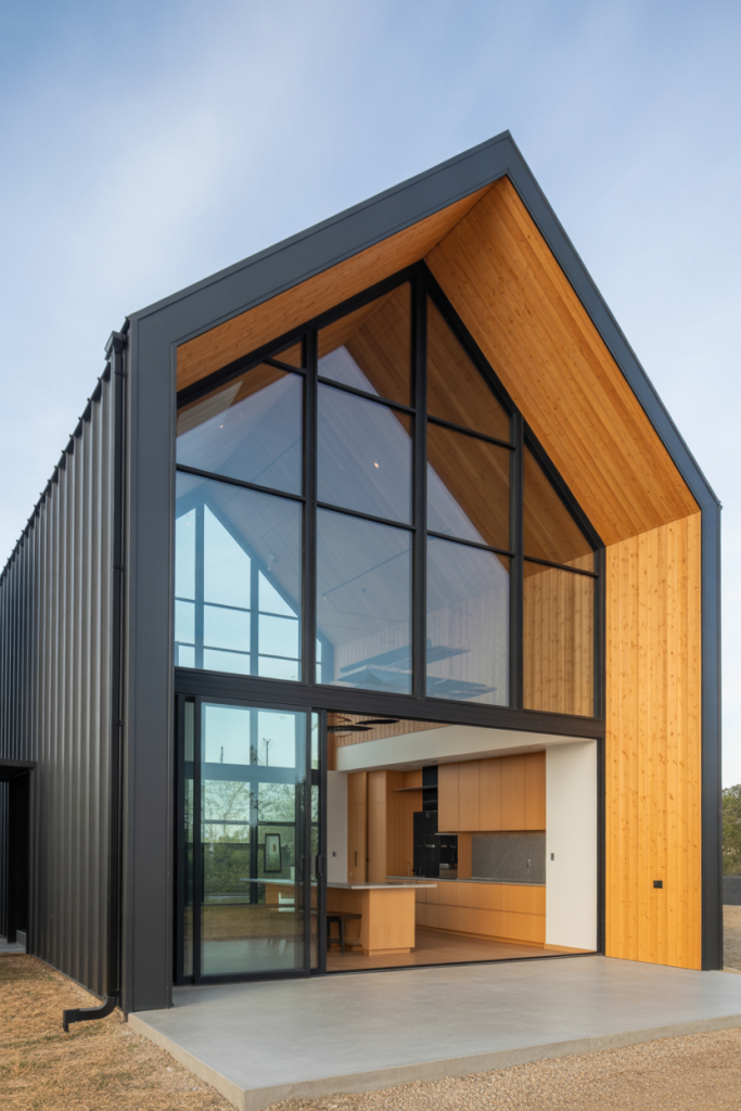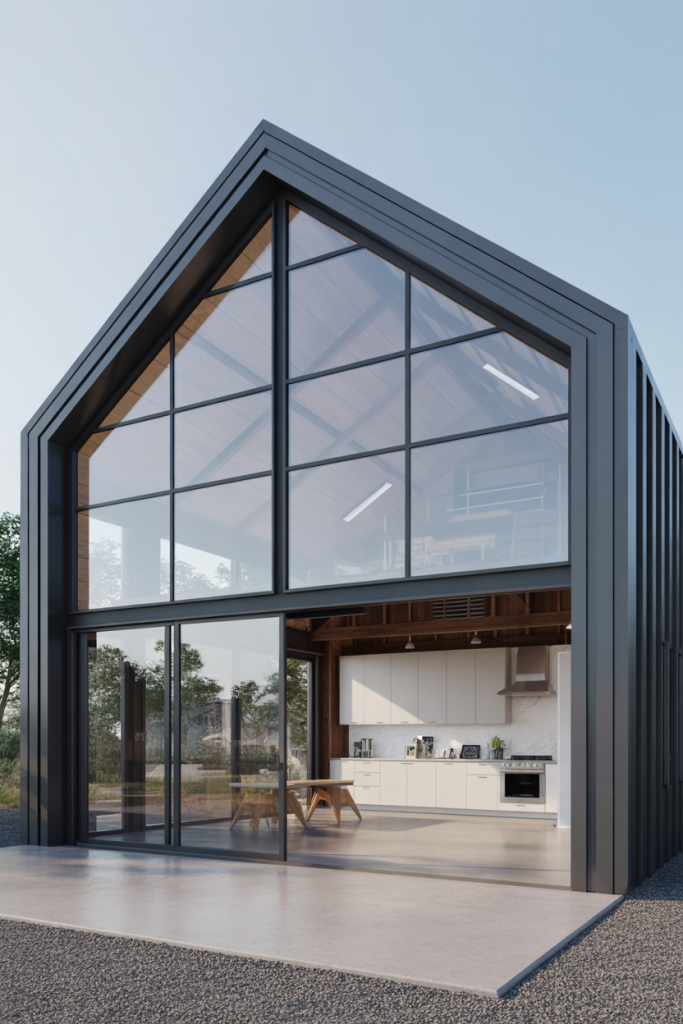 If your ideal home leans toward clean lines and sleek finishes, this idea begins with a modern exterior painted in matte black or charcoal, paired with natural wood siding and glass walls. Inside, open-plan interiors flow seamlessly from the kitchen into the living area, offering a refined yet approachable feel. On the main level, high ceilings draw the eye upward and make the space feel expansive. This style suits those who want a barndominium that feels current and architectural rather than purely rustic.