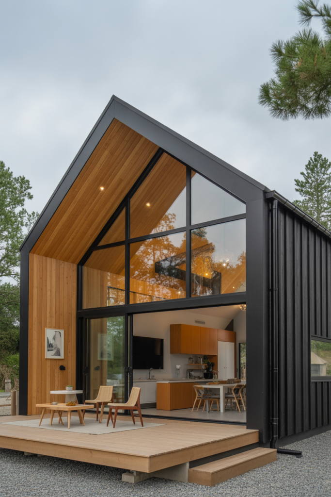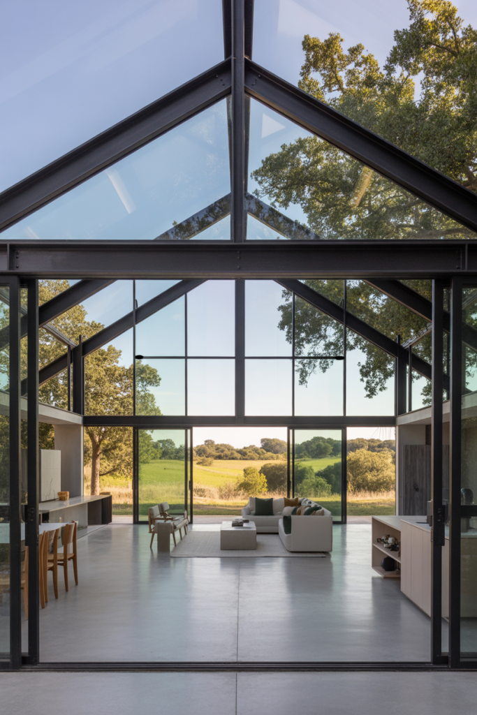 This sleek design is all about transparency and light. A full glass façade creates an impressive modern exterior, while inside, minimalist interiors with exposed steel and neutral tones highlight open floor plans. Perfect for scenic lots, the home feels like a gallery in nature — bold yet serene. Energy-efficient glass ensures comfort and sustainability year-round.
