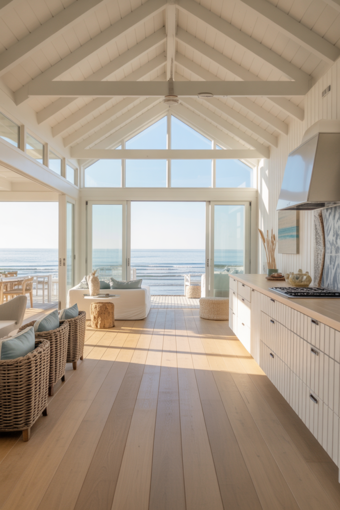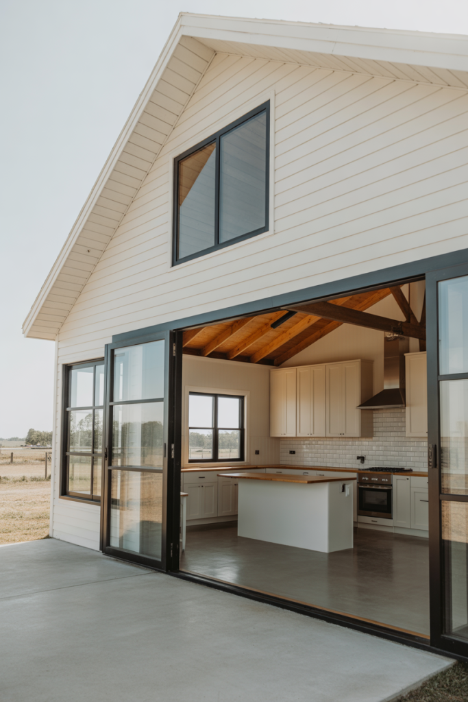 Perfect for seaside living, this modern barndominium embraces airy, sunlit interiors and weathered-white exterior colors. Large glass panels and breezy floor plans blur the line between indoors and outdoors. Light woods, linen fabrics, and touches of blue create a coastal calm that feels effortless yet refined. Ideal for those who dream of salty air and easy weekends by the water.