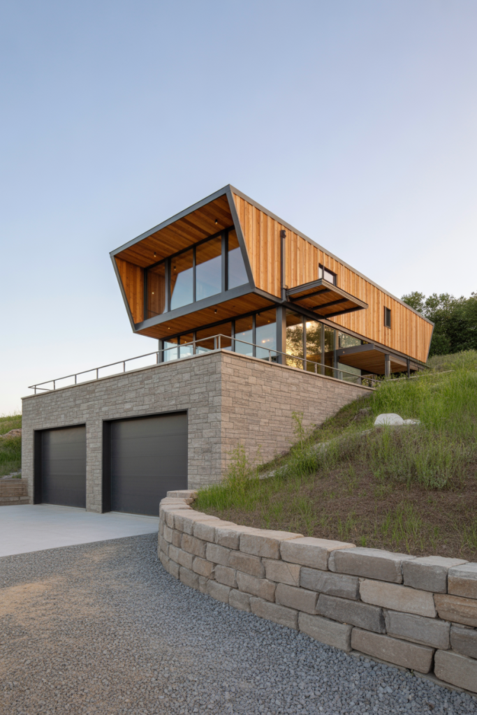 Here we marry the raw appeal of industrial design with the warmth of rustic elements. The exterior combines black metal panels with recycled timber siding, and the interior opens into a vast space with exposed steel beams, polished concrete floors, and a statement kitchen island. The floor plans allocate a dedicated garage and workspace zone but integrate them visually into the home’s flow. This hybrid style plays especially well in rural-urban fringe settings.