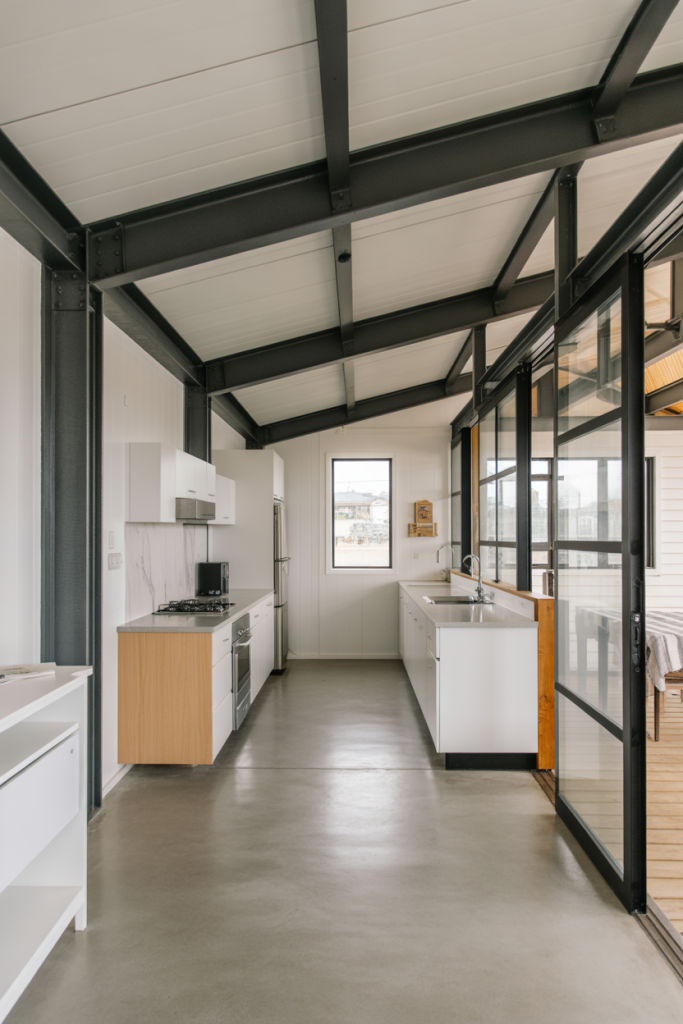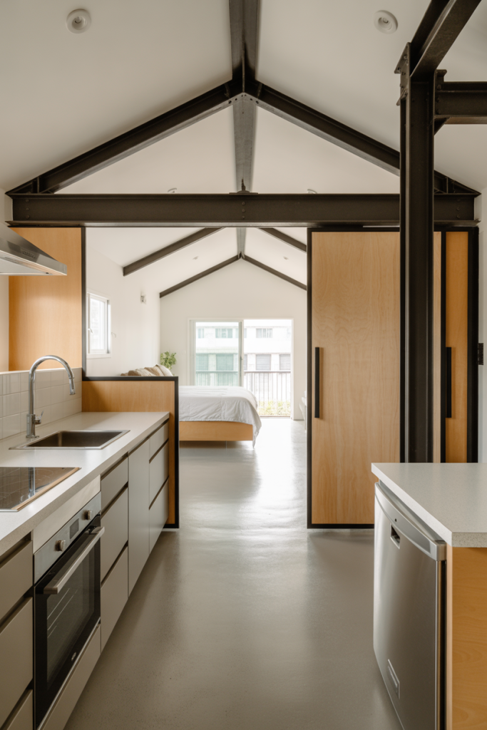 For the maker or entrepreneur, this concept centers around a substantial built-in shop space—perfect for a car enthusiast, woodworker, or small business. Adjacent to that, the home section features interiors modern with polished concrete floors, minimalist furnishings, and a sleek kitchen with industrial touches. The exterior is simple but bold—metal siding, generous windows, and a covered porch linking the living and working zones.